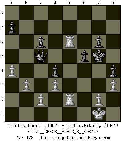 Last move : 1/2-1/2 2009 May 21 15:1:54 [Event "FICGS__CHESS__RAPID_B__000113"] [Site "FICGS"] [Date "2009.01.15"] [Round "1"] [White "Cirulis,Ilmars"] [Black "Timkin,Nikolay"] [Result "1/2-1/2"] [WhiteElo "1887"] [BlackElo "1844"] 1.f4 d5 2.e3 c5 3.Nf3 g6 4.Nc3 Bg7 5.b3 d4 6.exd4 cxd4 7.Ne4 Nf6 8.Bb5+ Nc6 9.Bxc6+ bxc6 10.Nxf6+ Bxf6 11.d3 O-O 12.O-O Qd6 13.Nd2 Bf5 14.a4 Rab8 15.Ba3 Qd5 16.Qf3 Rfe8 17.Rae1 h5 18.Ne4 Bg7 19.Ng5 e6 20.h3 Rbd8 21.Qe2 f6 22.Nf3 Bf8 23.Bxf8 Kxf8 24.Nh4 Kf7 25.Rf2 e5 26.Nxf5 exf4 27.Nh6+ Kg7 28.Qxe8 Rxe8 29.Rxe8 Kxh6 30.Rxf4 f5 31.Rf2 h4 32.Rfe2 Kg5 33.R2e5 Qd6 34.R8e6 Qa3 35.Re1 Qc5 36.R1e2 1/2-1/2 Bird's Opening Kingside Castling by player Black (move 11) Kingside Castling by player White (move 12) This chess game ended in a draw. Follow this game move after move (download)Chess problems demand from the composer the same virtues that characterize all worthwhile art: originality, invention, conciseness, harmony, complexity, and splendid insincerity. (Vladimir Nabokov) Unter Putin wird alles Geld aus Russland wie von einem Staubsauger nach Moskau umgeleitet, das ist wie ein schwarzes Loch. (Garry Kasparov) El Peón aislado arroja penumbra sobre todo el tablero. (Aaron Nimzovich) Les Echecs ont trois composantes : le temps, l'espace et le matériel en dernier. (Mikhail Tal) There's always a bigger fish. (Qui-Gon Jinn in Star Wars ep.1)