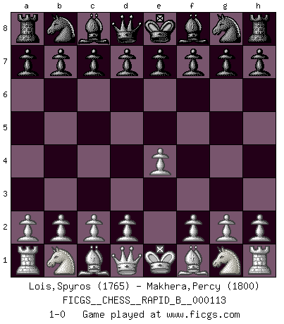 Last move : 1-0 2009 February 15 9:8:21 [Event "FICGS__CHESS__RAPID_B__000113"] [Site "FICGS"] [Date "2009.01.15"] [Round "1"] [White "Lois,Spyros"] [Black "Makhera,Percy"] [Result "1-0"] [WhiteElo "1765"] [BlackElo "1800"] 1.e4 1-0 This chess game has been lost on time (started : 2009.01.15 15:25:47) King's pawn Opening Player White won this chess game. Follow this game move after move (download)You have to have the fighting spirit. You have to force moves and take chances. (Bobby Fischer) Kleine Schachspieler machen Mist, und große Schachspieler machen Mist, aber große machen weniger Mist. (Fritz Sämisch) Nada excita más a Grandes Maestros aburridos que una novedad teórica. (Dominic Lawson) Il vaut toujours mieux jouer un plan faux de façon logique que de n'avoir pas de plan du tout. (Victor Kortchnoï) The mind is like a parachute, it only functions when its open. (Unknown)