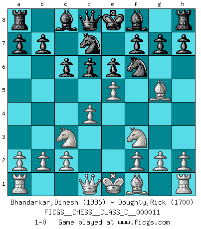 Last move : 1-0 2006 October 5 10:57:42 [Event "FICGS__CHESS__CLASS_C__000011"] [Site "FICGS"] [Date "2006.08.24"] [Round "1"] [White "Bhandarkar,Dinesh"] [Black "Doughty,Rick"] [Result "1-0"] [WhiteElo "1986"] [BlackElo "1700"] 1.e4 d6 2.d4 Nf6 3.Nc3 Nbd7 4.Nf3 e6 5.Bg5 c6 6.e5 1-0 This chess game has been lost on time (started : 2006.08.24 14:7:2) Pirc defense Player White won this chess game. Follow this game move after move (download)By this measure (on the gap between Fischer & his contemporaries), I consider him the greatest world champion. (Garry Kasparov) Das Schachspiel ist ein See, in welchem eine Mücke baden und ein Elefant ertrinken kann. (Emanuel Lasker) Evita las multitudes. Haz independientemente tu propio razonamiento. Trata de ser el jugador de Ajedrez, no la pieza de Ajedrez. (Ralph Charell) À la honte des hommes, on sait que les lois du jeu sont les seules qui soient partout justes, claires, inviolables et exécutées. Pourquoi l'Indien qui a donné les règles du jeu d'échecs est-il obéi de bon gré dans toute la terre, et que les décrétales des papes, par exemple, sont aujourd'hui un objet d'horreur et de mépris ? C'est que l'inventeur des échecs combina tout avec justesse pour la satisfaction des joueurs, et que les papes, dans leurs décrétales, n'eurent en vue que leur seul avantage. L'Indien voulut exercer également l'esprit des hommes et leur donner du plaisir; les papes ont voulu abrutir l'esprit des hommes. Voltaire (Dictionnaire philosophique / Garnier 1967) He who fights with monsters should be careful lest he thereby become a monster. (Friedrich Nietzsche, Beyond Good and Evil)