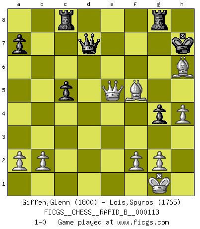 Last move : 1-0 2009 February 11 8:4:24 [Event "FICGS__CHESS__RAPID_B__000113"] [Site "FICGS"] [Date "2009.01.15"] [Round "1"] [White "Giffen,Glenn"] [Black "Lois,Spyros"] [Result "1-0"] [WhiteElo "1800"] [BlackElo "1765"] 1.e4 e5 2.Nf3 Nc6 3.Nc3 Bb4 4.Bc4 Nf6 5.Nd5 O-O 6.O-O Bc5 7.c3 Nxe4 8.d4 exd4 9.Qd3 Nf6 10.Bg5 Be7 11.Nxe7+ Qxe7 12.Rfe1 Qd8 13.Nxd4 h6 14.Bh4 d5 15.Bb3 Nxd4 16.cxd4 Be6 17.Bc2 Re8 18.Re3 g5 19.Bg3 b6 20.Rae1 Qd7 21.h4 g4 22.Bf4 c5 23.dxc5 bxc5 24.Bxh6 Rac8 25.Re5 Ne4 26.R1xe4 dxe4 27.Rg5+ Kh7 28.Qxe4+ f5 29.Qe5 Rg8 30.Rxf5 Bxf5 31.Bxf5+ 1-0 Three knights game Kingside Castling by player Black (move 5) Kingside Castling by player White (move 6) Player White won this chess game. Follow this game move after move (download)Good positions don't win games, good moves do. (Gerald Abrahams) Ein guter Spieler hat immer Glück. (José Raúl Capablanca) Con el tiempo, empecé a progresar en partidas decisivas. Tal vez porque me di cuenta de una simple verdad: no solo estaba yo nervioso sino también mi oponente. (Mikhail Tal) Je crois qu'il existe des manières très spécifiques de jouer efficacement contre une machine. Evidemment, nous n'avons aucune chance en technique pure, parce que l'ordinateur calcule de manière parfaite. Mais lorsque nous faisons appel à notre cerveau, en utilisant l'intuition et la compréhension, alors nous restons beaucoup plus forts. (Anatoli Karpov) 'preceded by its own quotation yields a falsehood' preceded by its own quotation yields a falsehood. (W. V. O. Quine - Set Theory And Its Logic, 1953)