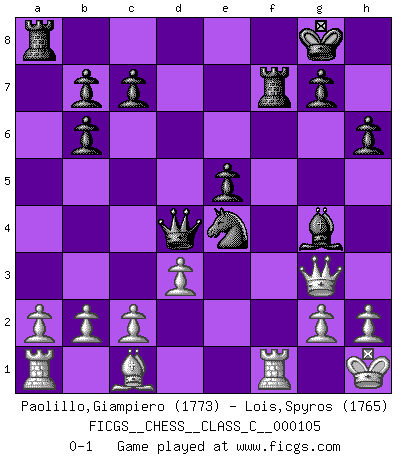 Last move : 0-1 2009 February 12 8:1:39 [Event "FICGS__CHESS__CLASS_C__000105"] [Site "FICGS"] [Date "2009.01.16"] [Round "1"] [White "Paolillo,Giampiero"] [Black "Lois,Spyros"] [Result "0-1"] [WhiteElo "1773"] [BlackElo "1765"] 1.e4 e5 2.Nc3 Bc5 3.Bc4 Nf6 4.f4 d6 5.Nf3 Nc6 6.d3 O-O 7.Na4 Bb6 8.Nxb6 axb6 9.O-O Bg4 10.Qe1 h6 11.fxe5 Nxe5 12.Nxe5 dxe5 13.Qg3 Qd4+ 14.Kh1 Nxe4 15.Bxf7+ Rxf7 0-1 Vienna game Kingside Castling by player Black (move 6) Kingside Castling by player White (move 9) Player Black won this chess game. Follow this game move after move (download)Everything is in a state of flux, and this includes the world of Chess. (Mikhail Botvinnik) Bobby Fischer ist kein Vorbild für die heutige Jugend. (Viktor Kortschnoi) El jugador de combinación piensa hacia adelante; comienza de la posición dada y trabaja las movidas contundentes en su mente. (Emanuel Lasker) Vous n'êtes pas toujours obligé de jouer le meilleur coup. Un coup doit être actif, entreprenant, correct et beau ! (David Bronstein) Nothing is more important for teaching us to understand the concepts we have than constructing fictitious ones. (Ludwig Wittgenstein)