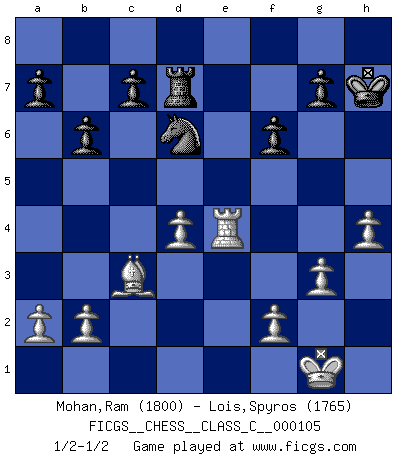 Last move : 1/2-1/2 2009 May 16 4:57:8 [Event "FICGS__CHESS__CLASS_C__000105"] [Site "FICGS"] [Date "2009.01.16"] [Round "1"] [White "Mohan,Ram"] [Black "Lois,Spyros"] [Result "1/2-1/2"] [WhiteElo "1800"] [BlackElo "1765"] 1.e4 e5 2.Nf3 Nf6 3.Nxe5 d6 4.Nf3 Nxe4 5.d4 d5 6.Bd3 Be7 7.O-O Nc6 8.Re1 Bg4 9.c4 Nf6 10.cxd5 Nxd5 11.Nc3 O-O 12.h3 Bh5 13.Bxh7 Kxh7 14.Ng5 Bxg5 15.Qxh5+ Kg8 16.Bxg5 Qd7 17.Qf3 Ncb4 18.Re2 Rae8 19.Rae1 Rxe2 20.Rxe2 f6 21.Bd2 Rd8 22.Nxd5 Nxd5 23.Re4 b6 24.h4 Ne7 25.Qb3+ Kh8 26.Qf7 Nf5 27.Qxd7 Rxd7 28.Bc3 Kh7 29.g3 Nd6 1/2-1/2 Petrov : Classical attack Kingside Castling by player White (move 7) Kingside Castling by player Black (move 11) This chess game ended in a draw. Follow this game move after move (download)Chess is really ninety nine percent calculation. (Soltis) Der beste Spieler in einem Turnier gewinnt es nie. Er landet auf Platz zwei oder drei. (Siegbert Tarrasch) Coloca el contenido de las piezas del Ajedrez en un sombrero, agitalo vigorosamente, arrojalas en un tablero desde una altura de 30 centimetros y así obtendras el estilo de Steinitz. (H. E. Bird) Que feriez-vous si vous étiez en train de jouer aux échecs et que la fin du monde arrive ? Je continuerais à jouer. (Saint Borromée) Indecision is the key to flexibility. (Unknown)