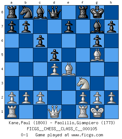 Last move : 0-1 2009 March 8 22:24:12 [Event "FICGS__CHESS__CLASS_C__000105"] [Site "FICGS"] [Date "2009.01.16"] [Round "1"] [White "Kane,Paul"] [Black "Paolillo,Giampiero"] [Result "0-1"] [WhiteElo "1800"] [BlackElo "1773"] 1.d4 f5 2.Bg5 g6 3.Nc3 Bg7 4.e4 fxe4 5.Nxe4 Nf6 6.Bd3 O-O 7.Nf3 c6 8.O-O Nxe4 9.Bxe4 d5 0-1 This chess game has been lost on time (started : 2009.01.16 4:59:22) Dutch, 2.Bg5 variation Kingside Castling by player Black (move 6) Kingside Castling by player White (move 8) Player Black won this chess game. Follow this game move after move (download)If your opponent cannot do anything active, then don't rush the position; instead you should let him sit there, suffer, and beg you for a draw. (Jeremy Silman) Aljechin war kein Nazi. Er war ein Opportunist. Ein schrecklicher Mann. Er liebte Geld über alles und würde für Geld ein Jude, ein Katolik oder ein Protestant werden. (Miguel Najdorf) Nada excita más a Grandes Maestros aburridos que una novedad teórica. (Dominic Lawson) Pour se monter efficace, un Cavalier a besoin d'avant-postes ! Les Cavaliers font les meilleurs bloqueurs de pions passés. Rules and bones are meant to be broken. (Anonymous)