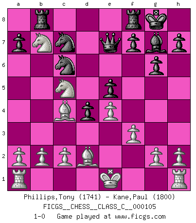 Last move : 1-0 2009 April 11 2:33:13 [Event "FICGS__CHESS__CLASS_C__000105"] [Site "FICGS"] [Date "2009.01.16"] [Round "1"] [White "Phillips,Tony"] [Black "Kane,Paul"] [Result "1-0"] [WhiteElo "1741"] [BlackElo "1800"] 1.Nf3 c5 2.d4 cxd4 3.Nxd4 g6 4.Qd3 Bg7 5.e3 Nf6 6.Bd2 O-O 7.Nc3 d5 8.Qb5 e5 9.Nb3 Nc6 10.f3 d4 11.Na4 Nd5 12.e4 Nc7 13.Qc4 Be6 14.Qd3 b5 15.Nac5 Bc4 16.Nb7 Qe7 17.Qxc4 bxc4 18.N3c5 Rab8 19.Bxc4 1-0 This chess game has been lost on time (started : 2009.01.16 4:59:22) Reti Opening Kingside Castling by player Black (move 6) Player White won this chess game. Follow this game move after move (download)When you don't know what to play, wait for an idea to come into your opponent's mind. You may be sure that idea will be wrong. (Siegbert Tarrasch) Ich hatte Angst gegen einen russischen Großmeister zu verlieren, und er befürchtete gegen einen kleinen Jungen zu verlieren. (über ein Remis gegen Juri Awerbach). (Robert James Fischer) Solo existe una cosa que Fischer hace en el Ajedrez sin placer: ¡perder!. (Boris Spassky) Assurément je connaissais par expérience le mystérieux attrait de ce jeu royal, le seul entre tous les jeux inventés par les hommes qui échappe souverainement à la tyrannie du hasard, le seul où l'on ne doive sa victoire qu'à son intelligence ou plutôt à une certaine forme d'intelligence. Mais n'est-ce pas déjà le limiter injurieusement que d'appeler les échecs un jeu ? N'est-ce pas une science, un art ou quelque chose qui, comme le cercueil de Mahomet entre ciel et terre, est suspendu entre l'un et l'autre, et qui réunit un nombre incroyable de contraires ? [...] C'est une pensée qui ne mène à rien, une mathématique qui n'établit rien, un art qui ne laisse pas d'uvre, une architecture sans matière; et il l'a prouvé néanmoins qu'il était plus durable, à sa manière, que les livres ou que tout autre monument, ce jeu unique qui appartient à tous les peuples et à tous les temps, et dont personne ne sait quel dieu en fit don à la terre pour tuer l'ennui, pour aiguiser l'esprit et stimuler l'âme. Où commence-t-il, où finit-il ? (Stefan Zweig) Perseverance does not equal worthiness. Next time you want to get my attention, wear something fun. Low-riding jeans are hot. (Gregory House, House M.D.)