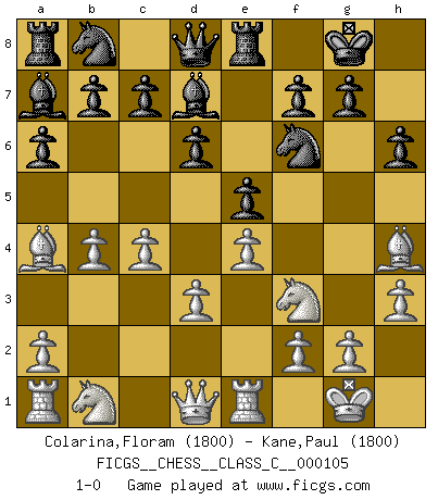 Last move : 1-0 2009 April 15 2:47:7 [Event "FICGS__CHESS__CLASS_C__000105"] [Site "FICGS"] [Date "2009.01.16"] [Round "1"] [White "Colarina,Floram"] [Black "Kane,Paul"] [Result "1-0"] [WhiteElo "1800"] [BlackElo "1800"] 1.e4 e5 2.Nf3 Nc6 3.Bb5 Nf6 4.O-O Bc5 5.c3 O-O 6.Re1 Re8 7.h3 a6 8.Ba4 d6 9.d3 Bd7 10.b4 Ba7 11.Bg5 h6 12.Bh4 Nb8 13.c4 1-0 Ruy Lopez : Berlin defense, Beverwijk variation Kingside Castling by player White (move 4) Kingside Castling by player Black (move 5) Player White won this chess game. Follow this game move after move (download)The winner of the game is the player who makes the next-to-last mistake. (Savielly Tartakover) Ich las kürzlich ein Buch von Nietzsche. Er sagte Religion verdumme nur die Menschen. Ich stimme zu. (Robert James Fischer) El juego de Damas es para vagabundos. (Paul Morphy) Lorsque vous vous retrouvez devant une position atroce, ne tendez pas un ultime piège dérisoire avec l'intention d'abandonner si l'adversaire le déjoue ! Faites-vous plutôt un devoir de résister comme si votre vie en dépendait. Jouez le coup qui vous déplairait au centuple si vous étiez dans la peau de votre tortionnaire ! Always two there are. No more no less. A master, and an apprentice. (Master Yoda in Star Wars ep.1)