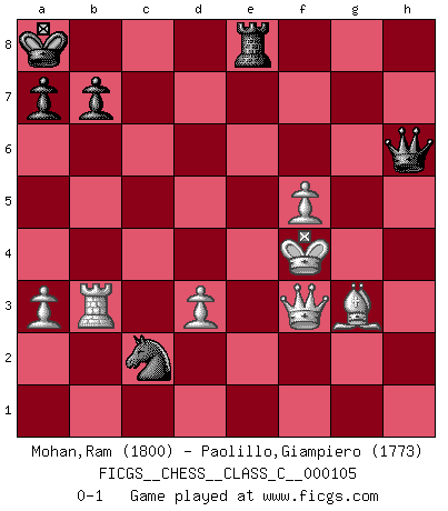 Last move : 0-1 2009 September 15 12:34:56 [Event "FICGS__CHESS__CLASS_C__000105"] [Site "FICGS"] [Date "2009.01.16"] [Round "1"] [White "Mohan,Ram"] [Black "Paolillo,Giampiero"] [Result "0-1"] [WhiteElo "1800"] [BlackElo "1773"] 1.e4 e6 2.d4 d5 3.Nc3 Bb4 4.e5 c5 5.a3 Bxc3+ 6.bxc3 Qc7 7.Qg4 Ne7 8.Qxg7 Rg8 9.Qxh7 cxd4 10.Ne2 Nbc6 11.f4 Bd7 12.Qd3 dxc3 13.Qxc3 O-O-O 14.Rb1 Nf5 15.Rg1 d4 16.Qd3 f6 17.g4 Nh4 18.exf6 e5 19.f7 Rxg4 20.Rxg4 Bxg4 21.Bh3 Qd7 22.Bxg4 Qxg4 23.Qg3 Qh5 24.Rb3 e4 25.Qg7 d3 26.cxd3 Nf3+ 27.Kf2 Qxh2+ 28.Ke3 Ncd4 29.Qg4+ Kb8 30.Nxd4 Nxd4 31.f8Q Nc2+ 32.Kxe4 Qh1+ 33.Qf3 Qh7+ 34.f5 Rxf8 35.Bf4+ Ka8 36.Bg3 Re8+ 37.Kf4 Qh6+ 0-1 French : Winawer, Classical variation Queenside Castling by player Black (move 13) Promotion Queen by player White (move 31) Player Black won this chess game. Follow this game move after move (download)I like the moment when I break a man's ego. (Bobby Fischer) Zu meiner Zeit war ein 20 jähriger ein junger Spieler, heute ist er ein Veteran. (Garry Kasparov) Muchos se han convertido en Maestros de Ajedrez, nadie se ha convertido en el Maestro del Ajedrez. (Siegbert Tarrasch) On croit qu'il y a plus de mauvais joueurs que de bons joueurs, c'est faux : Il y a autant de joueurs qui gagnent que de joueurs qui perdent. (Philippe Geluck) Whatever you do, don't be bored. This is absolutely the most exciting time we could have possibly hoped to be alive. And things are just starting. (From movie Waking life)