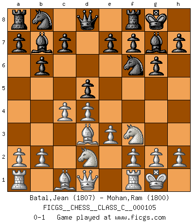 Last move : 0-1 2009 January 26 1:57:48 [Event "FICGS__CHESS__CLASS_C__000105"] [Site "FICGS"] [Date "2009.01.16"] [Round "1"] [White "Batal,Jean"] [Black "Mohan,Ram"] [Result "0-1"] [WhiteElo "1807"] [BlackElo "1800"] 1.d4 Nf6 2.Nf3 g6 3.Nbd2 d5 4.e3 Bg7 5.Bd3 O-O 6.O-O b6 7.c4 Bb7 0-1 King's Indian : East Indian defense Kingside Castling by player Black (move 5) Kingside Castling by player White (move 6) Player Black won this chess game. Follow this game move after move (download)Excellence at Chess is one mark of a scheming mind. (Sir Arthur Conan Doyle) Ich würde mich als ganz normalen Jungen bezeichnen [Im Alter von 12]. (Sergej Karjakin) El pensamiento metódico es mas útil en el Ajedrez que la inspiración. (C. J. S. Purdy) J'apprécie les joueurs d'est-indienne, c'est grâce à eux que je nourris ma famille depuis tant d'années. (Petrosian) Man is reluctant to give credit for intelligence to anyone, except his enemies. (Albert Einstein)