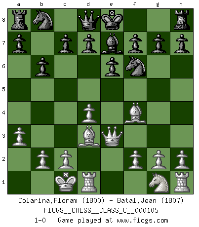 Last move : 1-0 2009 January 26 1:52:16 [Event "FICGS__CHESS__CLASS_C__000105"] [Site "FICGS"] [Date "2009.01.16"] [Round "1"] [White "Colarina,Floram"] [Black "Batal,Jean"] [Result "1-0"] [WhiteElo "1800"] [BlackElo "1807"] 1.e4 b6 2.d4 Bb7 3.Nc3 e6 4.Bf4 Bb4 5.Qd2 Bxe4 6.O-O-O Nf6 7.a3 Be7 8.Nxe4 Nxe4 9.Qe3 Nf6 10.Bd3 1-0 Owen defense Queenside Castling by player White (move 6) Player White won this chess game. Follow this game move after move (download)If Chess is a science, it's a most inexact one. If Chess is an art, it is too exacting to be seen as one. If Chess is a sport, it's too esoteric. If Chess is a game, it's too demanding to be just a game. If Chess is a mistress, she's a demanding one. If Chess is a passion, it's a rewarding one. If Chess is life, it's a sad one. (Unknown) Weshalb minderdergeübte Spieler mit g2-g4 beginnen? Die betreffenden sind unschlüssig, ob sie nun rechts (h4) oder links (f4) beginnen sollen, und in ihrer Ratlosigkeit entschliessen sie sich nach guter Bürgerart dazu, den goldenen Mittelweg zu wählen. (Aaron Nimzowitsch) En el Ajedrez, cuando menos, el valiente hereda la tierra. (Edmar Mednis) Aidez vos pièces, elles vous aideront. (Paul Morphy) Unless I accept my faults I will most certainly doubt my virtues. (Hugh Prather)