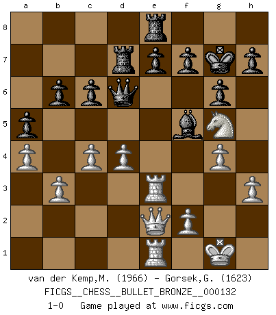 Last move : 1-0 2009 August 23 19:10:44 [Event "FICGS__CHESS__BULLET_BRONZE__000132"] [Site "FICGS"] [Date "2009.08.23"] [Round "1"] [White "van der Kemp,Michel"] [Black "Gorsek,Gregor"] [Result "1-0"] [WhiteElo "1966"] [BlackElo "1623"] 1.e4 g6 2.d4 Bg7 3.Nc3 d6 4.Nf3 Nf6 5.Be2 O-O 6.O-O c6 7.a4 a5 8.h3 Na6 9.Be3 Nb4 10.Qd2 Qc7 11.Rac1 Rd8 12.Rfe1 d5 13.exd5 Nbxd5 14.Nxd5 Nxd5 15.Bh6 Be6 16.Bxg7 Kxg7 17.c4 Nb4 18.Bd3 Nxd3 19.Qxd3 Qd6 20.Re3 Rd7 21.Qe2 Re8 22.Rd1 R7d8 23.Re1 Rd7 24.b3 b6 25.Ng5 Bf5 26.g4 1-0 This chess game has been lost on time (started : 2009.08.23 17:20:11) Robatsch defense : Two knights variation Kingside Castling by player Black (move 5) Kingside Castling by player White (move 6) Player White won this chess game. Follow this game move after move (download)Suddenly it was obvious to me in my analysis I had missed what Fischer had found with the greatest of ease at the board. (Mikhail Botvinnik) Matt entspricht nicht immer den Tatsachen. (Savielly Grigorievitsch Tartakower) Preferería tener un Peón que un dedo. (Reuben Fine) Vous n'êtes pas toujours obligé de jouer le meilleur coup. Un coup doit être actif, entreprenant, correct et beau ! (David Bronstein) When you stop learning you start dying. (Scott Adams)