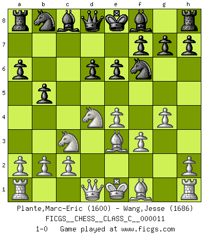 Last move : 1-0 2006 October 7 5:8:8 [Event "FICGS__CHESS__CLASS_C__000011"] [Site "FICGS"] [Date "2006.08.24"] [Round "1"] [White "Plante,Marc-Eric"] [Black "Wang,Jesse"] [Result "1-0"] [WhiteElo "1600"] [BlackElo "1686"] 1.e4 c5 2.Nf3 d6 3.d4 cxd4 4.Nxd4 Nf6 5.Nc3 e6 6.Be3 a6 7.f3 b5 8.g4 1-0 This chess game has been lost on time (started : 2006.08.24 14:7:2) Sicilian : Scheveningen variation Player White won this chess game. Follow this game move after move (download)Is Bobby Fischer quite sane ? (Salo Flohr) Es liegt in der Natur, vernüftig zu denken und unlogisch zu handeln. (Anatole France) El Ajedrez tiene tanto misterio como las mujeres. (Purdy) Un millionnaire : 'Monsieur Steinitz ! Vous ne participez aux tournois que pour l'argent, alors que moi je n'y viens que pour l'honneur.' Steinitz : 'Chacun joue pour ce qu'il n'a pas'... Remember : Your focus determines your reality. (Qui-Gon Jinn in Star Wars ep.1)