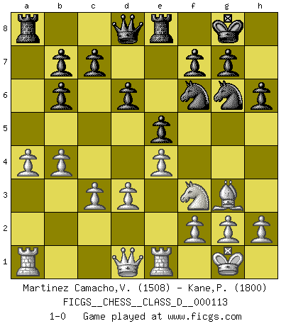 Last move : 1-0 2009 April 15 2:47:7 [Event "FICGS__CHESS__CLASS_D__000113"] [Site "FICGS"] [Date "2009.01.18"] [Round "1"] [White "Martinez Camacho,Victor Hugo"] [Black "Kane,Paul"] [Result "1-0"] [WhiteElo "1508"] [BlackElo "1800"] 1.e4 e5 2.Nf3 Nc6 3.Bb5 Nf6 4.O-O Bc5 5.d3 O-O 6.Bg5 h6 7.Bh4 d6 8.c3 Bd7 9.Nbd2 Re8 10.b4 Bb6 11.Nc4 Nb8 12.Bxd7 Nbxd7 13.Nxb6 axb6 14.Re1 Nf8 15.a4 Ng6 16.Bg3 1-0 Ruy Lopez : Berlin defense, Beverwijk variation Kingside Castling by player White (move 4) Kingside Castling by player Black (move 5) Player White won this chess game. Follow this game move after move (download)An attack on the wing should be met by play in the center. (Nimzovitch) Ich bewundere Kasparows phantasievolle Angriffssiege aus den Achtzigern und Neunzigern, aber wenn man sie mit dem Computer überprüft, nimmt der Computer in jeder zweiten Partie die Opfer an, verteidigt sich und gewinnt. (Vladimir Kramnik) El Rey es una pieza de pelea. ¡Usenlo!. (Wilhelm Steinitz) Un journaliste : 'Vous préférez avoir une dame de plus sur l'échiquier ou au lit ?' Boris Spassky : 'Ca dépend de la position.' . 'gn is not allowed in chess unless n is an integer between 1 and 8 inclusive, where 1 and 8 are to interpreted as the standard numerals standing for integers in the ordered real-closed field R, with the *canonical* ordering. (As opposed to, say, an integer in the domain Z[2+i*sqrt(5)] or an integer in some exotic Grothendieck topos). (Normajean Yates)