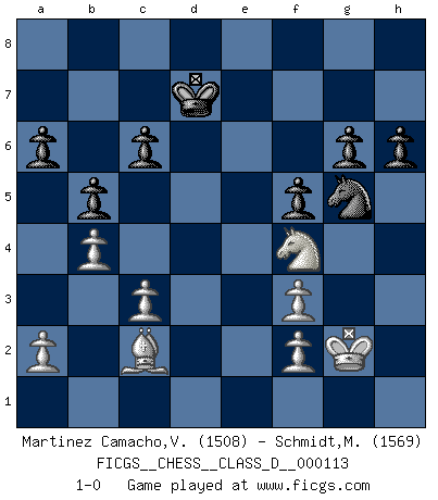 Last move : 1-0 2009 March 10 15:1:48 [Event "FICGS__CHESS__CLASS_D__000113"] [Site "FICGS"] [Date "2009.01.18"] [Round "1"] [White "Martinez Camacho,Victor Hugo"] [Black "Schmidt,Michael Wilhelm"] [Result "1-0"] [WhiteElo "1508"] [BlackElo "1569"] 1.e4 e5 2.Nf3 Nc6 3.Bb5 a6 4.Ba4 Nf6 5.O-O Be7 6.Re1 b5 7.Bb3 d6 8.h3 O-O 9.c3 Bb7 10.d3 Nb8 11.Bg5 h6 12.Bh4 Nh5 13.Bxe7 Qxe7 14.Nbd2 Nf4 15.Nf1 Nd7 16.Ng3 g6 17.Nh2 Nc5 18.Bc2 d5 19.d4 Nd7 20.exd5 Bxd5 21.dxe5 Nxe5 22.Qd4 Qg5 23.Qxe5 Qxe5 24.Rxe5 c6 25.Nf3 Bxf3 26.gxf3 Nxh3+ 27.Kf1 Rfe8 28.Rae1 Kf8 29.Rxe8+ Rxe8 30.Rxe8+ Kxe8 31.b4 Kd7 32.Ne2 f5 33.Kg2 Ng5 34.Nf4 1-0 Ruy Lopez : Closed Kingside Castling by player White (move 5) Kingside Castling by player Black (move 8) Player White won this chess game. Follow this game move after move (download)Botvinnik tried to take the mystery out of Chess, always relating it to situations in ordinary life. He used to call Chess a typical inexact problem similar to those which people are always having to solve in everyday life. (Garry Kasparov) Ein Schachgenie ist jemand der verdammt gut Schach spielt. (Jonathan Levitt) Por tratar de evitar la pérdida de una pieza, muchas personas han perdido una partida de Ajedrez. (Savielly Tartakover) Le pion, dans sa simplicité, marche droit devant lui, mais lorsqu'il prend, il le fait obliquement? Ainsi l'homme, tant qu'il reste pauvre, marche dans la droiture et vit honnêtement, mais lorsqu'il recherche les honneurs, il flatte, se parjure et, par les voies obliques, cherche une position supérieure sur l'échiquier du monde. (Jean de Galles) Art is the triumph over chaos. (John Cheever)