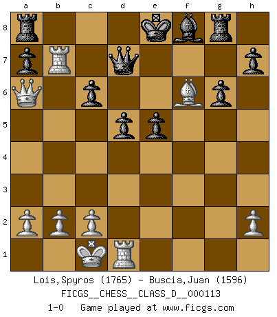 Last move : 1-0 2009 May 5 4:53:18 [Event "FICGS__CHESS__CLASS_D__000113"] [Site "FICGS"] [Date "2009.01.18"] [Round "1"] [White "Lois,Spyros"] [Black "Buscia,Juan"] [Result "1-0"] [WhiteElo "1765"] [BlackElo "1596"] 1.e4 c5 2.Nf3 e6 3.d4 cxd4 4.Nxd4 Nf6 5.Nc3 d6 6.Be3 Nc6 7.g4 Nxd4 8.Bxd4 e5 9.Be3 Bxg4 10.Qd2 Bf3 11.Rg1 Nxe4 12.Bb5+ Ke7 13.Nd5+ Ke6 14.Qd3 Nxf2 15.Bxf2 Bxd5 16.O-O-O Bc6 17.Bxc6 bxc6 18.Qc4+ Kd7 19.Qxf7+ Kc8 20.Qc4 Qd7 21.Rg3 d5 22.Qa6+ Qb7 23.Qa4 g6 24.Rb3 Qd7 25.Qa6+ Kd8 26.Bh4+ Ke8 27.Bf6 Rg8 28.Rb7 1-0 Sicilian : Anderssen variation Queenside Castling by player White (move 16) Player White won this chess game. Follow this game move after move (download)My style is somewhere between that of Tal and Petrosian. (Reshevsky) Ich hatte Zahnschmerzen im ersten Spiel. In der zweiten Partie tat mir der Kopf weh. In der dritten war es eine Rheuma-Attacke und während der vierten fühlte ich mich nicht gut. Und in der fünften? Nun, man muss doch nicht jedes Spiel gewinnen, oder? (Savielly Grigorievitsch Tartakower) El Ajedrez es un cuento de Hadas de las 1001 metidas de pata. (Savielly Tartakower) Fischer est le meilleur joueur du monde et Karpov n'est qu'un joueur de bistrot. (Garry Kasparov, agé de 16 ans) Information on the Internet is subject to the same rules and regulations as conversation at a bar. (George Lundberg)
