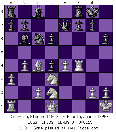 Last move : 1-0 2009 April 28 4:19:43 [Event "FICGS__CHESS__CLASS_D__000113"] [Site "FICGS"] [Date "2009.01.18"] [Round "1"] [White "Colarina,Floram"] [Black "Buscia,Juan"] [Result "1-0"] [WhiteElo "1800"] [BlackElo "1596"] 1.e4 c5 2.Nf3 Nc6 3.d4 cxd4 4.Bc4 e6 5.O-O Bc5 6.a3 Nf6 7.Bg5 h6 8.Bxf6 Qxf6 9.Nbd2 d6 10.b4 Bb6 11.Ne1 e5 12.Kh1 O-O 13.f4 exf4 14.Nd3 Qe7 15.Rxf4 1-0 Sicilian defense Kingside Castling by player White (move 5) Kingside Castling by player Black (move 12) Player White won this chess game. Follow this game move after move (download)There must have been a time when men were demigods, or they could not have invented Chess. (Gustav Schenk) Gott hat gewollt, dass ich Champion werde. (Surab Azmajparaschvili) No es una movida, aún la mejor movida que tu debas buscar, sino un plan comprensible. (Eugene Znosko-Borovsky) Le moment que je préfère le plus dans une rencontre, c'est celui où je sens que la personnalité de l'adversaire se brise. (Robert Fischer) Who needs drugs and alcohol if he can play Big Chess at FICGS ? (Heinz-Georg Lehnhoff)