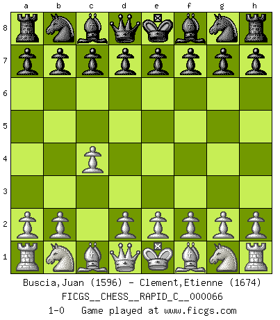 Last move : 1-0 2009 February 17 21:19:28 [Event "FICGS__CHESS__RAPID_C__000066"] [Site "FICGS"] [Date "2009.01.18"] [Round "1"] [White "Buscia,Juan"] [Black "Clement,Etienne"] [Result "1-0"] [WhiteElo "1596"] [BlackElo "1674"] 1.c4 1-0 This chess game has been lost on time (started : 2009.01.18 13:55:3) English Opening Player White won this chess game. Follow this game move after move (download)Your body has to be in top condition. Your Chess deteriorates as your body does. You can't separate body from mind. (Bobby Fischer) Mit Schach schule ich mein Gefühl für Geometrie, was für Tennis und Schach gleichermaßen wichtig ist. (Boris Becker) Nos gusta pensar. (Gary Kasparov) Les Cavaliers se révèlent fort utiles dans les positions fermées. D'habitude, les Fous sont un peu plus forts que les Cavaliers dans les positions ouvertes. Qu'on le veuille ou non, il restera toujours des exceptions ! Train yourself to let go of everything you fear to lose. (Master Yoda in Star Wars ep.3)