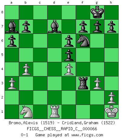 Last move : 0-1 2009 February 1 6:42:54 [Event "FICGS__CHESS__RAPID_C__000066"] [Site "FICGS"] [Date "2009.01.18"] [Round "1"] [White "Bromo,Alexis"] [Black "Cridland,Graham"] [Result "0-1"] [WhiteElo "1519"] [BlackElo "1522"] 1.e4 c5 2.Nf3 Nc6 3.d4 cxd4 4.Nxd4 e6 5.Nc3 Qc7 6.Bd3 Nxd4 7.O-O Nc6 8.g3 a6 9.Bf4 d6 10.a3 Nf6 11.Re1 Ne5 12.Bxe5 dxe5 13.Qd2 Bc5 14.Be2 O-O 15.Bf3 Bd7 16.b4 Ba7 17.Rad1 Rac8 18.Nb1 Qxc2 19.Qxc2 Rxc2 20.Rd2 Rfc8 21.Rxc2 Rxc2 22.Rd1 Rxf2 23.Kh1 Rxf3 0-1 Sicilian defense Kingside Castling by player White (move 7) Kingside Castling by player Black (move 14) Player Black won this chess game. Follow this game move after move (download)Chess is in its essence a game, in its form an art, and in its execution a science. (Baron Tassilo) Bogoljubow: Matt in vier Zügen! Tartakower: Ich verbitte mir jede Belästigung! (Savielly Grigorievitsch Tartakower) Si pudieramos observar el interior de la cabeza de un jugador de Ajedrez, encontraríamos ahí un mundo lleno de sentimientos, imágenes, ideas, emoción y pasión. (Alfred Binet) Le jeu d'échecs fait naître et fortifie en nous plusieurs qualités précieuses dans le cours de l'existence, telles que la prévoyance, la circonspection, la prudence, et la persévérance. (Benjamin Franklin - 1783, la morale des échecs) The weakness of an artist is dogma. (Josh Waitzkin)