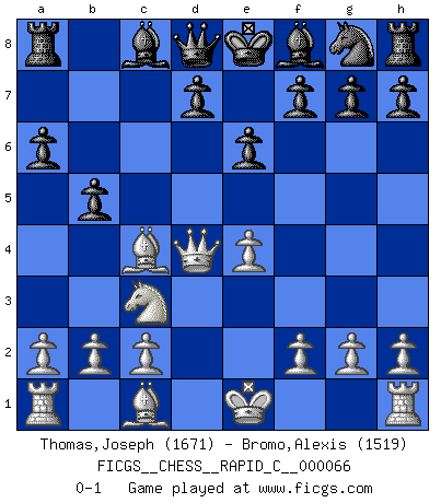 Last move : 0-1 2009 February 27 21:52:17 [Event "FICGS__CHESS__RAPID_C__000066"] [Site "FICGS"] [Date "2009.01.18"] [Round "1"] [White "Thomas,Joseph"] [Black "Bromo,Alexis"] [Result "0-1"] [WhiteElo "1671"] [BlackElo "1519"] 1.e4 c5 2.Nf3 Nc6 3.d4 cxd4 4.Nxd4 Nxd4 5.Qxd4 e6 6.Nc3 a6 7.Bc4 b5 0-1 This chess game has been lost on time (started : 2009.01.18 13:55:3) Sicilian defense Player Black won this chess game. Follow this game move after move (download)Chess teaches you to control the initial excitement you feel when you see something that looks good and it trains you to think objectively when you're in trouble. (Stanley Kubrick) Als er Schachweltmeister wurde ließ er praktisch alle stärksten Sovietspieler für sich arbeiten. Wenn ein auch nur mittelmässiger Meister ein Spezialist für eine bestimmte Eröffnung war, wurde er von Karpov gerufen. Das wurde alles geheim gehalten. (Mikhail Moiseyevich Botvinik) No hay precio que sea tan grande por la cabellera del Rey enemigo. (Koblentz) J'ai vu le vaincu d'Echecs jouer des années durant dans l'espoir de la fête de la victoire. Car tu es plus riche de ce qu'elle existe si même elle n'est point pour toi. Ainsi de la perle du fond des mers. (Antoine de Saint-Exupéry) Man is still the most extraordinary computer of all. (John F. Kennedy)