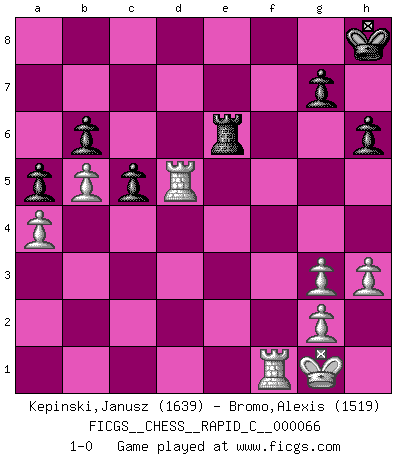 Last move : 1-0 2009 February 18 12:12:33 [Event "FICGS__CHESS__RAPID_C__000066"] [Site "FICGS"] [Date "2009.01.18"] [Round "1"] [White "Kepinski,Janusz"] [Black "Bromo,Alexis"] [Result "1-0"] [WhiteElo "1639"] [BlackElo "1519"] 1.e4 e5 2.c4 Nf6 3.d3 Nc6 4.Nf3 Bc5 5.h3 h6 6.Be2 O-O 7.O-O d6 8.Nbd2 Nd4 9.Nxd4 Bxd4 10.Rb1 Be6 11.b4 c5 12.b5 b6 13.a4 a5 14.Nf3 Nh7 15.Nh2 f5 16.exf5 Bxf5 17.Bf3 Ra7 18.Bd5+ Kh8 19.Qh5 Re7 20.Qe2 Ng5 21.Bb2 Bxb2 22.Rxb2 e4 23.dxe4 Nxe4 24.Qd3 Ng3 25.Qxg3 Be6 26.Bxe6 Rxe6 27.Nf3 d5 28.cxd5 Qxd5 29.Rd2 Rxf3 30.Rxd5 Rxg3 31.fxg3 1-0 King's pawn game Kingside Castling by player Black (move 6) Kingside Castling by player White (move 7) Player White won this chess game. Follow this game move after move (download)Bobby just drops the pieces and they fall on the right squares. (Miguel Najdorf) Ivan Sokolov treibt mich als Beifahrer an mit go Loeky go - . (Loek van Wely) Bobby Fischer es el mas grande genio de Ajedrez de todos los tiempos. (Alexander Kotov) Plusieurs personnes se sont demandées comment Tal faisait pour gagner... En fait, c'est très simple ! Il met ses pièces au centre de l'échiquier et les sacrifie quelque part ! (David Bronstein) The leaves of memory seemed to make a mournful rustling in the dark. (Henry Wadsworth Longfellow)