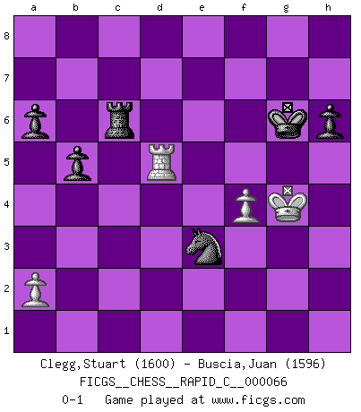Last move : 0-1 2009 March 20 0:6:40 [Event "FICGS__CHESS__RAPID_C__000066"] [Site "FICGS"] [Date "2009.01.18"] [Round "1"] [White "Clegg,Stuart"] [Black "Buscia,Juan"] [Result "0-1"] [WhiteElo "1600"] [BlackElo "1596"] 1.e4 c5 2.d4 cxd4 3.c3 dxc3 4.Nxc3 Nc6 5.Nf3 d6 6.Bc4 a6 7.O-O Nf6 8.e5 dxe5 9.Qxd8+ Nxd8 10.Nxe5 Be6 11.Bxe6 Nxe6 12.Rd1 g5 13.Be3 Bg7 14.Rac1 O-O 15.Nd7 Rfe8 16.Nxf6+ Bxf6 17.Rd7 b5 18.Nd5 Bxb2 19.Nxe7+ Rxe7 20.Rxe7 Bxc1 21.Bxc1 Rd8 22.g3 Rd1+ 23.Kg2 Rxc1 24.Ra7 Rc6 25.Kf3 f5 26.g4 fxg4+ 27.Kxg4 h6 28.h4 gxh4 29.Kxh4 Ng7 30.Kg4 Kh7 31.f4 Kg6 32.Rd7 Nf5 33.Rd5 Ne3+ 0-1 Sicilian : Smith-Morra gambit Kingside Castling by player White (move 7) Kingside Castling by player Black (move 14) 10 pieces endgame at move 29 : White KRPP , Black KRNPPP WHITE : King + 1 Rook 2 Pawns BLACK : King + 1 Rook 1 Knight 3 Pawns Player Black won this chess game. Follow this game move after move (download)Best by test: 1. e4 (Bobby Fischer) Schach ist wie eine schöne Frau, zu der wir ständig zurückkehren, gleichviel, wie oft sie uns zurückweist. (Anonymous) La partida mas dura de ganar es una partida ganada. (Emanuel Lasker) Un journaliste : 'Vous préférez avoir une dame de plus sur l'échiquier ou au lit ?' Boris Spassky : 'Ca dépend de la position.' A clear conscience is usually the sign of a bad memory. (Unknown)