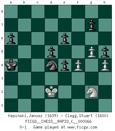 Last move : 0-1 2009 April 18 3:8:20 [Event "FICGS__CHESS__RAPID_C__000066"] [Site "FICGS"] [Date "2009.01.18"] [Round "1"] [White "Kepinski,Janusz"] [Black "Clegg,Stuart"] [Result "0-1"] [WhiteElo "1639"] [BlackElo "1600"] 1.Nf3 Nf6 2.c4 e6 3.d4 c5 4.e3 cxd4 5.exd4 Qa5+ 6.Bd2 Bb4 7.Bd3 O-O 8.O-O b6 9.Bxb4 Qxb4 10.Qc2 Bb7 11.a3 Qa5 12.b4 Qh5 13.Be2 Be4 14.Qd2 Qg6 15.g3 Qh5 16.Ng5 Qg6 17.Nxe4 Nxe4 18.Qe3 Ng5 19.f4 Qe4 20.Qxe4 Nxe4 21.Bf3 f5 22.Bxe4 fxe4 23.Re1 d5 24.Nd2 Nc6 25.Nb3 a6 26.c5 bxc5 27.bxc5 Rab8 28.Rab1 Rb7 29.Kf2 Rfb8 30.Nd2 Nxd4 31.Rxb7 Rxb7 32.Rb1 Rxb1 33.Nxb1 Kf8 34.g4 Ke7 35.h4 h6 36.Nc3 Kd7 37.g5 h5 38.Nb1 Kc6 39.Nc3 Nc2 40.a4 Kxc5 41.Ke2 Kd4 42.Nd1 Kc4 43.Kd2 Nd4 44.Ne3+ Kb4 45.Ng2 Kxa4 0-1 This chess game has been lost on time (started : 2009.01.18 13:55:3) Reti Opening Kingside Castling by player Black (move 7) Kingside Castling by player White (move 8) Player Black won this chess game. Follow this game move after move (download)There are tough players and nice guys, and I'm a tough player. (Bobby Fischer) Nicht daß Diemer aus Opportunismus Mitglied der NSDAP geworden wäre. Er war ein Fanatiker, in allem, was er tat. (Hans Ree) La mitad de las variaciones que son calculadas en una partida de torneo, resultan ser completamente superfluas. Desafortunadamente, nadie sabe por adelantado cual mitad. (Jan Tinman) Les échecs, c'est l'art d'analyser. (Mikhail Botvinnik) It is not enough to be a good player... you must also play well. (Siegbert Tarrasch)