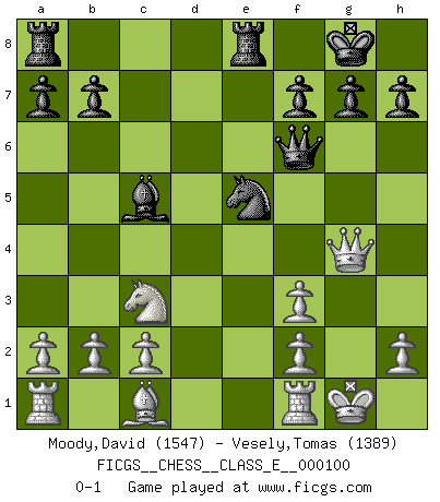 Last move : 0-1 2009 February 8 4:23:37 [Event "FICGS__CHESS__CLASS_E__000100"] [Site "FICGS"] [Date "2009.01.19"] [Round "1"] [White "Moody,David"] [Black "Vesely,Tomas"] [Result "0-1"] [WhiteElo "1547"] [BlackElo "1389"] 1.e4 e5 2.Nf3 Nf6 3.d4 Nxe4 4.Bd3 d5 5.Nxe5 c5 6.dxc5 Qf6 7.Nf3 Bxc5 8.O-O Bg4 9.Bxe4 dxe4 10.Qe2 Bxf3 11.gxf3 O-O 12.Qxe4 Nc6 13.Nc3 Rfe8 14.Qg4 Ne5 0-1 Petrov : Modern attack, Symmetrical variation Kingside Castling by player White (move 8) Kingside Castling by player Black (move 11) Player Black won this chess game. Follow this game move after move (download)When asked, -How is that you pick better moves than your opponents?, I responded: I'm very glad you asked me that, because, as it happens, there is a very simple answer. I think up my own moves, and I make my opponent think up his. (Alexander Alekhine) Der Umstand, daß uns eine 7 Stunden Zeitkontrolle ermöglicht eine großartige, tiefe Partie zu spielen, ist für die Massenmedien nicht weiter von Bedeutung. (Alexej Shirov) Un mal día en el Ajedrez, es mejor que cualquier buen día en el trabajo. (Anonymous) Le joueur d'Echecs qui veut atteindre le top est obligé de développer son propre credo créatif. Alexeï Stepanovicth Souétine. Il est facile d'écrire des livres ! Ce qui est difficile, c'est de jouer ! (Alexeï Stepanovicth Souétine) I fear not the man who has practiced 10,000 kicks once, but I fear the man who has practiced one kick 10,000 times. (Bruce Lee)