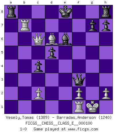 Last move : 1-0 2009 February 8 16:35:51 [Event "FICGS__CHESS__CLASS_E__000100"] [Site "FICGS"] [Date "2009.01.19"] [Round "1"] [White "Vesely,Tomas"] [Black "Barradas,Anderson"] [Result "1-0"] [WhiteElo "1389"] [BlackElo "1240"] 1.e4 c5 2.Bc4 e6 3.d4 d5 4.exd5 exd5 5.Bb5+ Bd7 6.a4 a6 7.Be2 Nf6 8.Nf3 c4 9.Ne5 Qa5+ 10.Nc3 Ne4 11.O-O Nxc3 12.bxc3 Qxc3 13.Bf4 Bd6 14.Nxf7 Kxf7 15.Bxd6 Nc6 16.Bf3 Be6 17.Rb1 b5 18.axb5 axb5 19.Rxb5 Nxd4 20.Rb7+ Ke8 21.Qb1 Nxf3+ 22.gxf3 Qxf3 23.Qb5+ Kd8 24.Qb6+ Ke8 25.Qc6+ 1-0 Sicilian defense Kingside Castling by player White (move 11) Player White won this chess game. Follow this game move after move (download)Fischer wanted to give the Russians a taste of their own medicine. (Larry Evans) Wenn du gegen Bobby spielst, ist es keine Frage von gewinnen oder verlieren. Es ist eine Frage des Überlebens. (Boris Vassilievich Spassky) Un mal plan es mejor que no tener ningún plan. (Frank Marshall) L'attaque fait le spectacle, la défense gagne les matchs. (Dicton footballistique) Waiting for chance ? Play in casinos. (FICGS proverb)