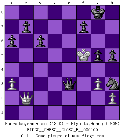 Last move : 0-1 2009 February 1 5:19:53 [Event "FICGS__CHESS__CLASS_E__000100"] [Site "FICGS"] [Date "2009.01.19"] [Round "1"] [White "Barradas,Anderson"] [Black "Higuita,Henry"] [Result "0-1"] [WhiteElo "1240"] [BlackElo "1505"] 1.e4 e5 2.Nf3 d6 3.d4 exd4 4.Nxd4 h6 5.Nc3 Nf6 6.Bd3 Nbd7 7.O-O Be7 8.Re1 O-O 9.Nf5 Ne5 10.f4 Nxd3 11.cxd3 Bxf5 12.exf5 Qd7 13.Ne4 Qxf5 14.Nxd6 Bxd6 15.Qf3 c6 16.a3 Rad8 17.Bd2 Bc5+ 18.Kh1 Qxd3 19.Be3 Bxe3 20.Rxe3 Qc2 21.Rc3 Qxb2 22.Rac1 Nd5 23.R3c2 Qf6 24.g3 Rfe8 25.Qf2 a6 26.Rd2 Ne3 27.Rxd8 Qxd8 28.Re1 Nd5 29.Rxe8+ Qxe8 30.Kg2 Qe4+ 31.Kh3 Qe3 32.Qb2 Nxf4+ 33.Kh4 g5+ 34.Kg4 h5+ 35.Kf5 Nh3 0-1 Philidor : Exchange variation Kingside Castling by player White (move 7) Kingside Castling by player Black (move 8) Player Black won this chess game. Follow this game move after move (download)The essence of Chess is thinking about what Chess is. (David Bronstein) Im Fernschach kannst du während dem Spiel rauchen. (John Christen Knudsen) Es muy difícil jugar en contra de la teoría de Einstein. - en su primera derrota en contra de Fischer (Mikhail Tal) Les réformistes prétendent que les progrès de la théorie conduiront à la disparition des échecs, et qu'il faut, pour leur rendre vie, en remanier les règles. En réalité, qu'exprime cette affirmation? Le mépris de l'intuition, de l'imagination et de tous les autres éléments qui font des échecs un art. (Alexander Alekhine) Crush them ! Make them suffer ! (General Grievous in Star Wars ep.3)