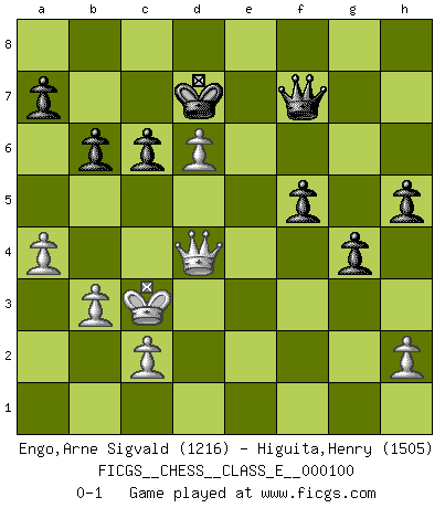 Last move : 0-1 2009 August 1 0:5:18 [Event "FICGS__CHESS__CLASS_E__000100"] [Site "FICGS"] [Date "2009.01.19"] [Round "1"] [White "Engo,Arne Sigvald"] [Black "Higuita,Henry"] [Result "0-1"] [WhiteElo "1216"] [BlackElo "1505"] 1.e4 e5 2.Nf3 Nc6 3.d4 exd4 4.Nxd4 Nxd4 5.Qxd4 d6 6.Nc3 c6 7.Bd2 Qf6 8.Qe3 Be7 9.O-O-O Be6 10.g3 Bd8 11.f4 Bb6 12.Qf3 O-O-O 13.Bg2 Qe7 14.b3 f5 15.Rhe1 Qf6 16.e5 dxe5 17.fxe5 Qf7 18.Be3 Qc7 19.g4 fxg4 20.Qg3 Bxe3+ 21.Rxe3 Ne7 22.Rxd8+ Rxd8 23.Be4 h5 24.Ne2 Qa5 25.a4 Qc5 26.Kb2 Nf5 27.Bxf5 Bxf5 28.Rc3 Qe7 29.Qf4 g6 30.Nd4 Qd7 31.Nxf5 gxf5 32.Rd3 Qe6 33.Rd6 Rxd6 34.exd6 Kd7 35.Kc3 b6 36.Qd4 Qf7 0-1 This chess game has been lost on time (started : 2009.01.19 4:34:8) Scotch game Queenside Castling by player White (move 9) Queenside Castling by player Black (move 12) Player Black won this chess game. Follow this game move after move (download)Chess is as much a mystery as women. (Purdy) Im Wettkampf zwischen starken Meistern kommen Fehler sehr selten vor, deshalb ist es mit bloßem Warten nicht getan. (José Raúl Capablanca) No es suficiente ser un buen jugador, se debe también de jugar bién. (Siegbert Tarrasch) Toute estimation doit être constamment réévaluée. (Jacob Estrin) He who fights with monsters should be careful lest he thereby become a monster. (Friedrich Nietzsche, Beyond Good and Evil)
