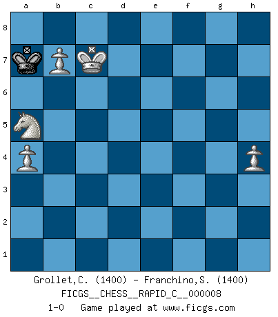 Last move : 1-0 2006 October 1 17:48:34 [Event "FICGS__CHESS__RAPID_C__000008"] [Site "FICGS"] [Date "2006.08.24"] [Round "1"] [White "Grollet,Christian"] [Black "Franchino,Sebastian"] [Result "1-0"] [WhiteElo "1400"] [BlackElo "1400"] 1.c4 e5 2.g3 Nc6 3.Bg2 Bc5 4.e3 d6 5.Ne2 Nf6 6.d4 Bb4 7.Nbc3 O-O 8.O-O Re8 9.a3 Bxc3 10.Nxc3 exd4 11.exd4 b6 12.Bxc6 Bh3 13.Bxe8 Bxf1 14.Bxf7+ Kxf7 15.Qxf1 Qd7 16.Bg5 Re8 17.Bxf6 Kxf6 18.Re1 Rxe1 19.Qxe1 h6 20.Qe2 c6 21.d5 cxd5 22.Qf3+ Kg6 23.Qxd5 Kh7 24.Nb5 Qe7 25.Nxd6 a6 26.Qe4+ Qxe4 27.Nxe4 Kg6 28.c5 bxc5 29.Nxc5 a5 30.a4 Kf5 31.Nb3 g5 32.Nxa5 h5 33.g4+ hxg4 34.Kg2 Ke4 35.b4 g3 36.Kxg3 Kd5 37.b5 Kd6 38.b6 Kd7 39.f4 gxf4 40.Kxf4 Kc8 41.b7+ Kb8 42.h4 Kc7 43.Ke5 Kb8 44.Kd6 Ka7 45.Kc7 1-0 Comment by player 2 : Sebastian Franchino : Thank´s. So do I English Opening Kingside Castling by player Black (move 7) Kingside Castling by player White (move 8) 10 pieces endgame at move 32 : White KNPPPPP , Black KPP WHITE : King + 1 Knight 5 Pawns BLACK : King + 2 Pawns 9 pieces endgame at move 33 : White KNPPPP , Black KPP WHITE : King + 1 Knight 4 Pawns BLACK : King + 2 Pawns 8 pieces endgame at move 36 : White KNPPPP , Black KP WHITE : King + 1 Knight 4 Pawns BLACK : King + 1 Pawn 7 pieces endgame at move 39 : White KNPPP , Black KP WHITE : King + 1 Knight 3 Pawns BLACK : King + 1 Pawn 6 pieces endgame at move 40 : White KNPPP , Black K WHITE : King + 1 Knight 3 Pawns BLACK : King + Player White won this chess game. Follow this game move after move (download)Chess is a part of culture and if a culture is declining then Chess too will decline. (Mikhail Botvinnik) Bis jetzt ist Weiß einer wohlbekannten Analyse gefolgt. Aber jetzt begeht er einen schrecklichen Fehler: Er beginnt seinen eigenen Kopf zu benutzen. (Siegbert Tarrasch) Tu eres para mi la Reina en d8 y yo soy el Peón en d7!!. (GM Eduard Gufeld) Les échecs sont utiles à l'exercice de la faculté de penser et à celle de l'imagination. Car nous devons posséder une méthode élaborée pour atteindre des buts partout où nous devons conduire notre raison. (Leibnitz) The various flowers seem good to different people. (Chinese proverb)