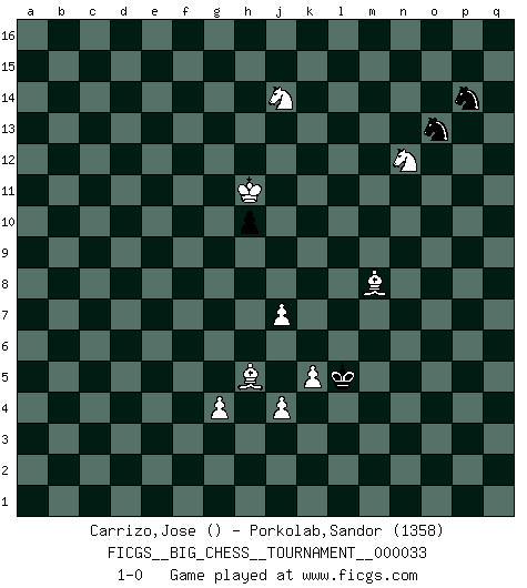 Last move : 1-0 2009 July 2 8:42:45 [Event "FICGS__BIG_CHESS__TOURNAMENT__000033"] [Site "FICGS"] [Date "2009.01.19"] [Round "1"] [White "Carrizo,Jose"] [Black "Porkolab,Sandor"] [Result "1-0"] [WhiteElo ""] [BlackElo "1358"] 1.d2-d4 n15-n13 2.e2-e4 j15-h13 3.f1-d3 e15-e13 4.b1-c3 m15-m13 5.p1-o3 l16-n14 6.g2-g4 o16-m14 7.f2-f4 d15-d13 8.n2-n3 f16-d14 9.j3-j4 c16-e14 10.k2-k3 h16-q8 11.l1-k2 q8-b8 12.e4-e5 o15-o13 13.k1-j3 p16-o14 14.o1-h7 n13-n12 15.m2-m4 h15-j13 16.l2-l4 b8-b4 17.g1-f3 k16-h15 18.a2-a3 b4-k12 19.k3-k4 b16-d15 20.k4-k5 d15-f14 21.j2-g3 g16-j15 22.f4-f5 j15-l14 23.f3-g5 c15-c13 24.j1-j2 a15-a14 25.g5-j6 m14-p11 26.h3-h4 m13-m12 27.f5-f6 m12-m11 28.h2-k3 f14-g12 29.k2-l3 e13-e12 30.m4-m5 d13-d12 31.c1-h6 e14-a10 32.d3-f5 a10-f5 33.g3-f5 e16-e14 34.h6-f8 d14-h10 35.h1-a8 p11-m14 36.f8-g7 h15-f14 37.c3-e4 j16-j15 38.e4-g5 m14-n13 39.b2-b3 n13-g7 40.f5-g7 a16-c16 41.c2-c4 b15-b13 42.d4-d5 o14-m13 43.e5-e6 e12-e11 44.j3-h5 g12-f10 45.k3-j5 m13-k14 46.b3-b4 p15-p14 47.f6-f7 k12-j12 48.o3-m4 j13-g12 49.p2-p3 f14-e12 50.o2-o4 h10-n15 51.a1-a2 n15-o14 52.n3-n4 l14-j13 53.o4-o5 e12-c11 54.p3-p4 m16-m13 55.q2-q3 m13-l13 56.j2-k3 q16-e16 57.m4-n6 c11-a12 58.a8-q8 j12-l12 59.q8-q15 e16-q16 60.q15-p14 o14-q12 61.p14-p7 q12-j5 62.h4-j5 l12-l4 63.k3-k2 l4-n4 64.p7-m4 n4-p2 65.m1-m2 p2-p3 66.e1-p1 p3-h10 67.k2-k3 c16-p16 68.m4-n5 h10-h11 69.h7-f9 h11-k9 70.a2-d2 e11-e10 71.f9-h7 k9-c9 72.c4-c5 p16-p9 73.n5-k8 e14-e11 74.l3-q8 l13-k13 75.k8-n5 p9-q9 76.q8-o6 c9-a9 77.d2-d3 q9-q3 78.q1-q3 q16-q3 79.p1-p3 q3-q1 80.d5-d6 q1-a1 81.k3-k4 k13-l13 82.n6-l5 l13-l8 83.p3-l3 f10-d9 84.g7-e8 a9-a4 85.h7-k9 l8-p8 86.p4-p5 p8-p10 87.n5-q2 e11-a11 88.q2-q15 e10-e9 89.q15-l15 p10-a10 90.o6-q8 a4-b5 91.m2-m3 b5-c4 92.d3-g3 c4-c1 93.l15-n13 n14-m15 94.n13-m12 m15-e8 95.f7-e8 d9-f10 96.d6-d7 a10-a3 97.g3-a3 a11-a3 98.l3-a3 a1-a3 99.m3-a3 c1-a3 100.l5-k3 a3-b4 101.k9-f5 b4-c5 102.m12-o14 c5-g1 103.k4-l3 g1-n1 104.l3-k2 n1-o2 105.k2-j3 o2-o5 106.q8-o6 o5-m5 107.o14-o13 m5-m6 108.j3-j2 m6-n6 109.o13-o9 f10-d11 110.o9-f9 g12-e13 111.e6-e7 n6-o7 112.f9-f6 o7-k11 113.d7-d8 k11-e11 114.f6-f9 a12-c11 115.g5-f7 e9-d8 116.e7-d8 e11-f11 117.f9-f11 e13-f11 118.p5-p6 j15-k16 119.h5-j7 d11-f10 120.e8-e9 f10-h11 121.j7-k9 k14-m15 122.k3-l5 a14-a13 123.l5-k7 f11-g9 124.j6-h8 g9-f7 125.h8-f7 m15-l13 126.k7-l9 k16-l15 127.l9-j10 l15-m14 128.o6-e15 c13-c12 129.e15-c13 d12-d11 130.f5-j8 h11-f12 131.j8-c14 f12-d13 132.d8-d9 c11-d9 133.c14-d13 f15-f14 134.d13-c14 b13-b12 135.c13-b14 c12-c11 136.b14-a13 d11-d10 137.e9-d10 c11-d10 138.a13-b12 d9-f10 139.b12-d10 f10-h11 140.j10-l11 m14-n13 141.d10-g7 n13-o13 142.j2-k3 h13-k12 143.k3-l4 o13-p12 144.l4-m5 k15-k13 145.c14-k7 p12-p11 146.m5-n6 p11-o10 147.l11-k13 k12-l10 148.k13-l15 h11-k12 149.l15-j16 k12-h13 150.n6-n7 n12-n11 151.f7-g9 l13-k11 152.g9-j10 o10-p9 153.j16-l15 p9-p8 154.l15-j14 p8-p7 155.k7-n4 m11-m10 156.j5-j6 l10-n9 157.g7-l3 p7-q6 158.k9-m8 k11-j9 159.m8-o7 n9-o7 160.n7-o7 q6-p5 161.l3-m2 p5-p4 162.p6-p7 j13-l12 163.p7-p8 l12-n13 164.m2-g7 n13-o11 165.g7-j9 o11-n9 166.o7-o8 p4-p5 167.j9-k10 p5-o4 168.n4-l6 o4-o5 169.k10-m8 n9-l10 170.m8-l7 g15-g13 171.l6-n8 h13-j11 172.p8-p9 o5-n4 173.p9-p10 l10-m12 174.n8-m9 n11-n10 175.m9-k7 n4-m4 176.j10-l11 n10-n9 177.o8-o9 m4-l4 178.j6-j7 l4-k4 179.k7-h5 k4-l5 180.p10-p11 h14-h13 181.p11-p12 h13-h12 182.p12-p13 h12-h11 183.p13-p14 m12-o13 184.h5-g6 o13-p11 185.o9-o10 p11-q13 186.g6-h5 q13-p15 187.o10-n10 j11-l12 188.l11-n12 g13-g12 189.n10-m11 l12-k10 190.m11-m10 k10-j8 191.l7-n9 j8-h6 192.m10-l10 f14-f13 193.l10-k11 h6-j8 194.k11-j12 j8-k10 195.j12-h12 k10-m11 196.n9-m8 p15-o13 197.h12-g13 m11-n13 198.g13-f13 n13-p14 199.f13-g12 h11-h10 200.g12-h11 1-0 Follow this game move after move (download)Help your pieces so they can help you. (Paul Morphy) Im Blitz ist es einfacher mit einer Figur weniger anzugreifen, als sich mit einer Mehrfigur zu verteidigen. (Mikhail Nekhemyevich Tal) El Ajedrez es un juego de pelea el cual es puramente intelectual e incluye la suerte. (Richard Reti) Demandez au pauvre Cg1 ce qu'il en pense. Eduard Gufeld à propos de la variante Saemisch de l'Est-Indienne. Thibault, I ask for draw. Game 13876. - Sorry Ilmars, you won. (FICGS chat)