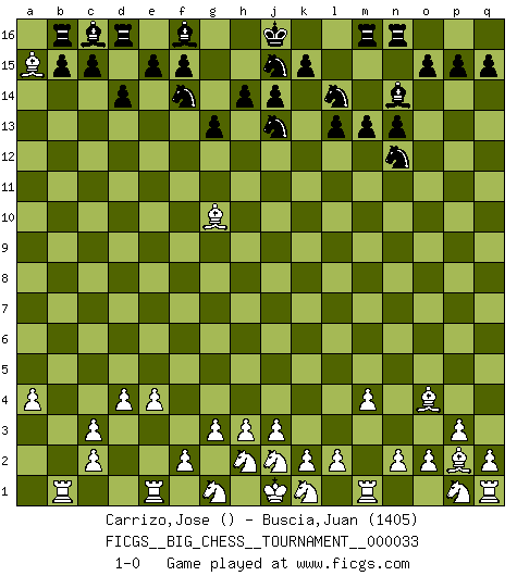 Last move : 1-0 2009 March 23 23:49:29 [Event "FICGS__BIG_CHESS__TOURNAMENT__000033"] [Site "FICGS"] [Date "2009.01.19"] [Round "1"] [White "Carrizo,Jose"] [Black "Buscia,Juan"] [Result "1-0"] [WhiteElo ""] [BlackElo "1405"] 1.d2-d4 m15-m13 2.e2-e4 n15-n13 3.b1-c3 o16-b4 4.f1-c4 b4-c3 5.b2-c3 p16-o14 6.a1-b1 l16-n14 7.p2-p3 b16-c14 8.o1-p2 g15-g13 9.g2-g3 h16-f14 10.h1-f3 a16-b16 11.f3-f14 g16-f14 12.m2-m4 l15-l13 13.c4-h9 q16-n16 14.a2-a4 o14-n12 15.l1-o4 d15-d14 16.h9-c14 e16-d16 17.c14-g10 k16-l14 18.c1-j7 h15-j13 19.j7-a15 1-0 This big chess game has been lost on time (started : 2009.01.19 7:9:16) Follow this game move after move (download)A chess genius has died; a loss for humanity. (Viktor Kortchnoi, about Bobby Fischer's death) Er war ein guter Schachspieler, aber ich kann Leute nicht ausstehen, die 'Heil Hitler' rufen (Über Alexander Aljechin). (Miguel Najdorf) Sin errores no puede haber brillantez. (Emanuel Lasker) Pour se monter efficace, un Cavalier a besoin d'avant-postes ! Les Cavaliers font les meilleurs bloqueurs de pions passés. Industry executives and analysts often mistakenly talk about strategy as if it were some kind of chess match. But in chess, you have just two opponents, each with identical resources, and with luck playing a minimal role. The real world is much more like a poker game, with multiple players trying to make the best of whatever hand fortune has dealt them. In our industry, Bill Gates owns the table until someone proves otherwise. (David Moschella, 'Computerworld')