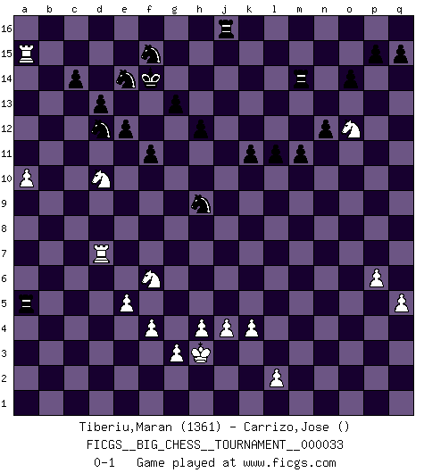 Last move : 0-1 2009 May 27 17:17:27 [Event "FICGS__BIG_CHESS__TOURNAMENT__000033"] [Site "FICGS"] [Date "2009.01.19"] [Round "1"] [White "Tiberiu,Maran"] [Black "Carrizo,Jose"] [Result "0-1"] [WhiteElo "1361"] [BlackElo ""] 1.j2-k4 n15-n13 2.d2-d3 m15-m13 3.m2-m3 d15-d14 4.e2-e4 p16-o14 5.p2-p3 b16-c14 6.f1-e2 k15-k13 7.o1-p2 l15-l13 8.l1-o4 e15-e13 9.h1-l4 l13-l12 10.n2-n3 f16-e15 11.p1-n2 o16-l13 12.m3-m4 h15-k14 13.e2-k7 g15-g14 14.m1-m3 j14-j13 15.m3-l3 c16-d15 16.h2-j4 k16-j14 17.c1-k8 f15-f13 18.b1-c3 e15-k10 19.l4-l10 h16-f14 20.e1-e3 j14-k12 21.l10-p10 q16-p16 22.e3-f3 l16-k15 23.j1-h2 f13-f12 24.a2-a4 m13-m12 25.p10-p6 j15-h13 26.g1-j2 g16-j15 27.k1-m2 j16-h15 28.j2-h4 e16-e15 29.k4-j6 k12-j10 30.k8-h10 k14-j12 31.h10-l13 j12-l13 32.m2-k3 h13-g11 33.j4-l5 k15-h13 34.p6-k6 j10-l9 35.k7-l6 f14-j11 36.a4-a5 l13-m11 37.l6-g10 h13-j12 38.g10-j12 g11-j12 39.a5-a6 l9-j8 40.k6-j5 d15-k9 41.q1-m1 j11-e11 42.a1-a5 e11-b8 43.g2-g3 b8-b2 44.c3-d5 b2-c2 45.h2-g2 c2-b2 46.o4-k8 j15-h13 47.a5-c5 h13-g11 48.m1-c1 g11-h9 49.k8-e3 b2-j9 50.n2-o4 j12-g11 51.o4-n6 j8-g7 52.j6-g7 j9-j5 53.k3-j5 k10-g7 54.k2-k4 m11-k10 55.n6-m8 k9-g12 56.e3-l9 g14-g13 57.l5-k7 o14-m13 58.h4-f5 g7-a13 59.h3-h4 l12-l11 60.o2-o4 h14-h13 61.k7-j9 j13-j12 62.j9-l10 k13-k12 63.j5-h7 k12-k11 64.l10-j9 m13-k12 65.f5-e7 k12-j10 66.l9-g5 d14-d13 67.m8-k9 e13-e12 68.q2-q4 m16-k16 69.j9-g10 h13-h12 70.e7-g8 a13-b14 71.a6-a7 j12-j11 72.g10-e9 p16-l16 73.g2-h3 l16-l14 74.p3-p4 j10-k12 75.p4-p5 g12-k9 76.h7-f6 f12-f11 77.g8-j9 k12-l10 78.j9-l10 k9-l10 79.e9-g8 c14-e13 80.n3-n4 c15-c14 81.n4-n5 b14-m4 82.l3-l4 m4-n3 83.d3-d4 l14-o14 84.c1-o1 n13-n12 85.g5-p13 o14-o13 86.p13-n15 k16-k14 87.o4-o5 o15-o14 88.p5-p6 a16-n16 89.n15-j11 h9-j11 90.g8-j9 l10-m9 91.f3-f5 n3-h8 92.j9-h7 n16-n13 93.n5-n6 o13-o10 94.h7-k8 m9-n8 95.j3-j4 n13-o13 96.k8-h7 n8-p6 97.o5-p6 o10-o1 98.p2-o1 o13-o1 99.n6-n7 k14-k13 100.e4-e5 k13-p13 101.q4-q5 p13-o13 102.f6-h5 e15-e14 103.h7-k6 e14-m14 104.f5-f8 h8-g9 105.f8-b8 g9-c5 106.b8-b15 h15-g14 107.d4-c5 e13-f15 108.b15-a15 g11-f13 109.k6-m7 o1-n1 110.m7-l9 o13-k13 111.a15-c15 f13-d12 112.d5-e7 n1-n7 113.e7-c8 n7-c7 114.c8-d10 c7-c5 115.f2-f4 j11-h13 116.l4-l7 h13-f12 117.h5-f6 m14-m16 118.l7-d7 f12-e14 119.c15-b15 m16-j16 120.l9-n10 k13-m13 121.n10-o12 m13-m14 122.a7-a8 m12-m11 123.a8-a9 g14-f14 124.a9-a10 c5-a5 125.b15-a15 k10-h9 0-1 Follow this game move after move (download)When you don't know what to play, wait for an idea to come into your opponent's mind. You may be sure that idea will be wrong. (Siegbert Tarrasch) Ohne Fehler kann es keine Brillanz geben. (Emanuel Lasker) Jugadores de primera clase pierden en contra de jugadores de segunda clase porque los jugadores de segunda clase a veces juegan una partida de primer clase. (Siegbert Tarrasch) Les réformistes prétendent que les progrès de la théorie conduiront à la disparition des échecs, et qu'il faut, pour leur rendre vie, en remanier les règles. En réalité, qu'exprime cette affirmation? Le mépris de l'intuition, de l'imagination et de tous les autres éléments qui font des échecs un art. (Alexander Alekhine) I find television to be very educating. Every time somebody turns on the set, I go in the other room and read a book. (Groucho Marx)