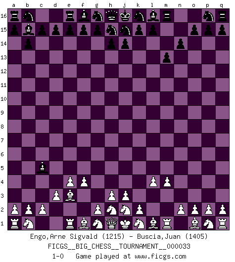 Last move : 1-0 2009 March 24 23:56:36 [Event "FICGS__BIG_CHESS__TOURNAMENT__000033"] [Site "FICGS"] [Date "2009.01.19"] [Round "1"] [White "Engo,Arne Sigvald"] [Black "Buscia,Juan"] [Result "1-0"] [WhiteElo "1215"] [BlackElo "1405"] 1.e2-e4 n15-n14 2.m2-m4 b15-b14 3.d2-d3 c16-b15 4.f2-f4 m15-m13 5.l2-l4 o16-c5 6.c1-e3 1-0 This big chess game has been lost on time (started : 2009.01.19 7:9:16) Follow this game move after move (download)Examine moves that smite! A good eye for smites is far more important than a knowledge of strategical principles. (Purdy) Ich organisiere ein großes Turnier, was mich etwa 120000 Dollar kostet. Ich denke, das ist das erste Mal in der Schachgeschichte, daß ein Schachgroßmeister auch als Mäzen auftritt. (Miguel Najdorf) EL Ajedrez es como la vida. (Boris Spassky) Les échecs, c'est l'art d'analyser. (Mikhail Botvinnik) Memory is a crazy woman that hoards colored rags and throws away food. (Austin O'Malley)