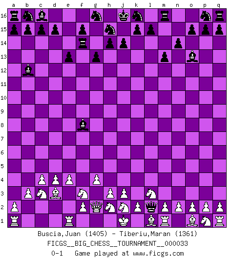 Last move : 0-1 2009 March 17 11:3:7 [Event "FICGS__BIG_CHESS__TOURNAMENT__000033"] [Site "FICGS"] [Date "2009.01.19"] [Round "1"] [White "Buscia,Juan"] [Black "Tiberiu,Maran"] [Result "0-1"] [WhiteElo "1405"] [BlackElo "1361"] 1.g2-g4 g15-g13 2.b2-b3 m15-m13 3.d2-d4 e15-e13 4.c1-n11 l16-o13 5.n11-j15 h16-j15 6.e2-e4 e16-e14 7.c2-c4 e14-f14 8.h1-g2 n15-n14 9.b1-c3 f16-b12 10.f1-d3 j15-l13 11.g1-f3 l13-l2 12.k1-l3 o16-f8 0-1 This big chess game has been lost on time (started : 2009.01.19 7:9:16) Follow this game move after move (download)The way he plays Chess demonstrates a man's whole nature. (Stanley Ellin) Offener Brief an US-Präsident Bush anlässlich der Verhaftung Bobby Fishers: Verhaften Sie mich. Stecken Sie mich in dieselbe Zelle wie Bobby Fisher und geben Sie uns ein Schachspiel mit. (Boris Vassilievich Spassky) Existen dos clases de sacrificios: los correctos y los míos. (Mikhail Tal) Votre prénom est 'Tactique', votre deuxième prénom est 'Tactique' et votre nom est 'Tactique'. (Ken Smith) When I took office, only high energy physicists had ever heard of what is called the World Wide Web... Now even my cat has its own page. (Bill Clinton, 1996)