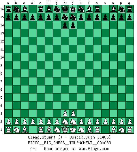 Last move : 0-1 2009 January 19 7:12:37 [Event "FICGS__BIG_CHESS__TOURNAMENT__000033"] [Site "FICGS"] [Date "2009.01.19"] [Round "1"] [White "Clegg,Stuart"] [Black "Buscia,Juan"] [Result "0-1"] [WhiteElo ""] [BlackElo "1405"] 0-1 Follow this game move after move (download)He who takes the Queen's Knight's Pawn will sleep in the streets. (Anonymous) Du weisst es gibt ein Problem mit Computern und Fernschach, wenn jeder eine Rating von 2450 hat. (John Christen Knudsen) Bobby solo arroja las piezas y solas caen en las casillas correctas. (Miguel Najdorf ) Il n'y a plus de joueurs du niveau de Jacob Murray dont la seule quête est le beau jeu, le plaisir de voir les pièces construire quelque chose. Sur 10 idées à la minute, 9 seront sans intérêt, la dernière s'avèrera géniale. (Christian Bauer) Luck is the residue of design. (John Milton)