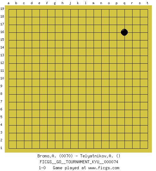 Last move : 1-0 2009 February 19 21:27:49 [Event "FICGS__GO__TOURNAMENT_KYU__000074"] [Site "FICGS"] [Date "2009.01.20"] [Round "1"] [Black "Bromo,Alexis"] [White "Telyatnikov,Anatoly"] [Result "1-0"] [Rating 1 "0070"] 1.q16 1-0 This go game has been lost on time (started : 2009.01.20 13:31:20) Here are the names of the openings (joseki) played in the four corners : Player Black won this Go (weiqi, baduk) game. Follow this game move after move (download)If a formation is symmetrical, play at the center. (Anonymous) An expert is a man who has made all the mistakes which can be made in a very narrow field. (Niels Bohr)