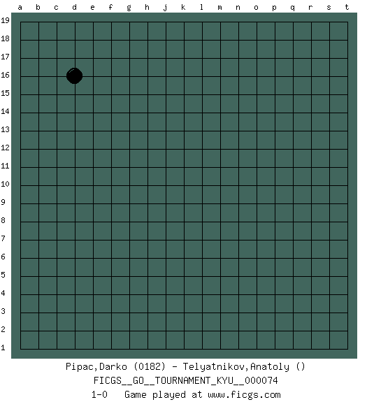 Last move : 1-0 2009 February 19 21:27:49 [Event "FICGS__GO__TOURNAMENT_KYU__000074"] [Site "FICGS"] [Date "2009.01.20"] [Round "1"] [Black "Pipac,Darko"] [White "Telyatnikov,Anatoly"] [Result "1-0"] [Rating 1 "0182"] 1.d16 1-0 This go game has been lost on time (started : 2009.01.20 13:31:20) Here are the names of the openings (joseki) played in the four corners : Player Black won this Go (weiqi, baduk) game. Follow this game move after move (download)Win the stones, lose the game. (Anonymous) The bottom line is always the bottom line. (Johann Piek)