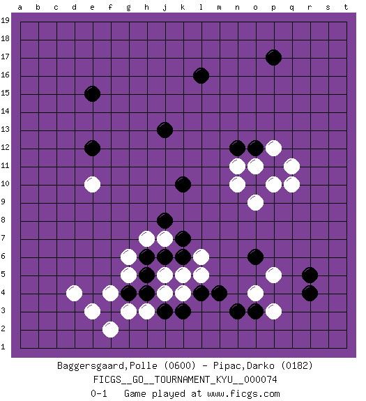 Last move : 0-1 2009 March 30 1:33:27 [Event "FICGS__GO__TOURNAMENT_KYU__000074"] [Site "FICGS"] [Date "2009.01.20"] [Round "1"] [Black "Baggersgaard,Polle"] [White "Pipac,Darko"] [Result "0-1"] [Rating 1 "0600"] [Rating 2 "0182"] 1.k10 p5 2.e15 q10 3.p17 d4 4.l16 e10 5.f3 f4 6.g4 g3 7.m4 f2 8.h4 e3 9.o12 o11 10.o3 o4 11.j13 k4 12.n3 p3 13.k3 j4 14.p11 p10 15.j3 h3 16.o10 n11 17.j8 g5 18.n12 n10 19.o6 o9 20.h5 j5 21.h6 g6 22.r5 p12 23.r4 q11 24.e12 h7 25.j6 j7 26.k6 l6 27.k7 l5 28.l4 k5 0-1 This go game has been lost on time (started : 2009.01.20 13:31:20) Here are the names of the openings (joseki) played in the four corners : Corner d4 : d4 f3 Hoshi (Hwajeom, Seongjeom, Xingwei`) 4-4 Point. The star or hoshi (4-4) point, emphasizing influence at the potential expense of territory. Ikken Kakari (Hankan Keolch'im, Yi Gua`jiao~, 1-Space Low Approach). Black 2 is the standard approach move to the 4-4. Corner q4 : p5 m4 Go-no-go (Wu~wu~) 5-5 Point. The 5-5 was experimented with briefly during the "New Fuseki" movement in Japan in the 1930s. The 5-5 point has not retained popularity because the 4-4 hoshi (star) point strikes a better balance between influence and territory. As one can see from the variations, though, the 5-5 is playable. Player White won this Go (weiqi, baduk) game. Follow this game move after move (download)Against three in a row, play right in the center. (Anonymous) The Internet is the world's largest library. It's just that all the books are on the floor. (John Allen Paulos)