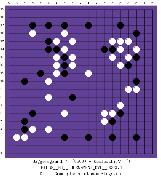 Last move : 0-1 2009 April 3 13:55:55 [Event "FICGS__GO__TOURNAMENT_KYU__000074"] [Site "FICGS"] [Date "2009.01.20"] [Round "1"] [Black "Baggersgaard,Polle"] [White "Koslowski,Volker"] [Result "0-1"] [Rating 1 "0600"] 1.r16 d4 2.r3 d16 3.p17 r9 4.d6 f4 5.c4 c3 6.c5 b3 7.c10 l11 8.f17 n5 9.o3 h16 10.f15 g13 11.l3 f10 12.e11 p14 13.h15 j15 14.o14 o15 15.l17 g15 16.o5 p15 17.g14 h14 18.h17 n6 19.p13 q13 20.d17 o6 21.f14 f8 22.h13 j13 23.q14 q15 24.q12 r14 25.p6 p7 26.n14 p12 27.h12 j12 28.h3 g12 29.r10 q9 30.r13 o13 31.h11 g11 32.j8 h6 0-1 This go game has been lost on time (started : 2009.01.20 13:31:20) Here are the names of the openings (joseki) played in the four corners : Corner q4 : r3 r9 San-San (Sam-Sam, San-San) 3-3 Point. The San-San (3-3) point, emphasizing territory at the expense of influence. Corner d4 : d4 d6 Hoshi (Hwajeom, Seongjeom, Xingwei`) 4-4 Point. The star or hoshi (4-4) point, emphasizing influence at the potential expense of territory. Ikken Takagakari (Hankan Nop'dakeolch'im, Yi Gaojia, 1-Space High Approach). White typically responds at 6-4 or 3-10. White 4-10 is played when White finds play on the right side advantageous. White 4-8 or 3-8 may be played when White has support at top. Corner d16 : d16 f17 Hoshi (Hwajeom, Seongjeom, Xingwei`) 4-4 Point. The star or hoshi (4-4) point, emphasizing influence at the potential expense of territory. Ikken Kakari (Hankan Keolch'im, Yi Gua`jiao~, 1-Space Low Approach). Black 2 is the standard approach move to the 4-4. Player White won this Go (weiqi, baduk) game. Follow this game move after move (download)More haste less speed. (John Fairbairn) There are two kinds of tragedy in this world, one is not getting what you want and the other is getting. (Lord of war)