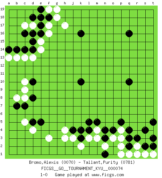 Last move : 1-0 2009 April 10 14:31:54 [Event "FICGS__GO__TOURNAMENT_KYU__000074"] [Site "FICGS"] [Date "2009.01.20"] [Round "1"] [Black "Bromo,Alexis"] [White "Tallant,Purity"] [Result "1-0"] [Rating 1 "0070"] [Rating 2 "0781"] 1.q16 d4 2.q4 c17 3.d16 d17 4.e17 e18 5.f18 f17 6.e16 f16 7.d18 g18 8.e19 g19 9.k16 e15 10.d15 e14 11.d14 d13 12.c14 c13 13.b14 b13 14.a14 a13 15.c16 f19 16.e18 h17 17.d10 c8 18.k4 f3 19.q10 j3 20.k10 l3 21.k3 k2 22.j4 h3 23.l4 m3 24.n3 m4 25.m5 h4 26.l5 n2 27.n4 o3 28.o4 p3 29.q2 p2 30.q3 q1 31.d8 c10 32.c7 c9 33.b7 b8 34.d5 c5 35.e5 p4 36.p5 r2 37.r3 s3 38.s4 t4 39.s2 r1 40.t3 s1 41.t5 t1 42.t2 p1 43.n1 1-0 This go game has been lost on time (started : 2009.01.20 13:31:20) Here are the names of the openings (joseki) played in the four corners : Corner d16 : c17 d16 San-San (Sam-Sam, San-San) 3-3 Point. The San-San (3-3) point, emphasizing territory at the expense of influence. Kata-tsuki (shoulder hit). The shoulder-hit is the traditional answer to the 3-3. The direction of White 3 depends on the positions on the side. Crawling once may be the premise for a follow-up move of sliding with a knight's move in the opposite direction. If White plays 3 at 3-4 (to the right), the follow-on knight's move is then played at the top (e.g. 3-4, 4-5, 5-2). White's knight's move reduces territory potential on the side it is played. Corner q4 : q4 l3 Hoshi (Hwajeom, Seongjeom, Xingwei`) 4-4 Point. The star or hoshi (4-4) point, emphasizing influence at the potential expense of territory. Player Black won this Go (weiqi, baduk) game. Follow this game move after move (download)The poor player plays the opponent's game for him. (Anonymous) The general who wins the battle makes many calculations in his temple before the battle is fought. The general who loses makes but few calculations beforehand. (Sun Tzu)