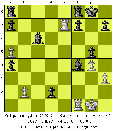 Last move : 0-1 2006 September 14 2:19:30 [Event "FICGS__CHESS__RAPID_C__000008"] [Site "FICGS"] [Date "2006.08.24"] [Round "1"] [White "Melquiades,Jay"] [Black "Baudement,Julien"] [Result "0-1"] [WhiteElo "1200"] [BlackElo "1137"] 1.e4 e5 2.d4 d6 3.c4 exd4 4.Qxd4 Nc6 5.h3 Nxd4 6.Na3 Nf6 7.Nf3 c5 8.Bd3 d5 9.Nxd4 dxe4 10.Be2 Qxd4 11.Nc2 Bf5 12.Nxd4 cxd4 13.c5 Bxc5 14.O-O d3 15.Bd1 Nd5 16.g4 Bd7 17.a4 O-O 18.Bb3 Bc6 19.a5 b6 20.Bd2 e3 21.Bxe3 Nxe3 22.fxe3 Bxe3+ 23.Kh2 g5 24.Ba4 b5 25.Rae1 Bf4+ 26.Kg1 bxa4 27.Re7 d2 0-1 King's pawn game Kingside Castling by player White (move 14) Kingside Castling by player Black (move 17) Player Black won this chess game. Follow this game move after move (download)Do you realize Fischer almost never has any bad pieces? He exchanges them, and the bad pieces remain with his opponents. (Yuri Balashov) Es war undenkbar für die Behörden, dass ein sowjetischer Großmeister auf diese Art und Weise [Fischer-Taimanov 6:0] verliert, ohne dass es eine politischer Erklärung dafür gäbe. (Mark Taimanov) El Ajedrez es un juego terrible. Si no dominas el centro, tu oponente tiene una posición mas libre. Si tu tienes el centro, entonces realmente tienes algo de que preocuparte. (Siegbert Tarrasch) Celui qui prend des risques peut perdre, celui qui n'en prend pas perd toujours. (Xavier Tartacover) Beta. Software undergoes beta testing shortly before it's released. Beta is latin for still doesn't work. (Anonymous)
