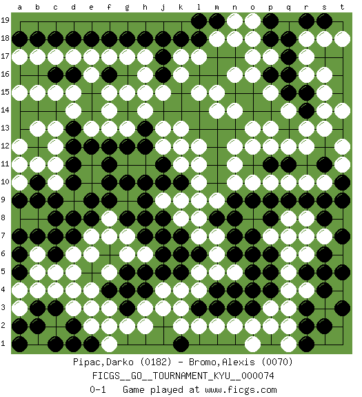 Last move : 0-1 2009 March 4 9:7:55 [Event "FICGS__GO__TOURNAMENT_KYU__000074"] [Site "FICGS"] [Date "2009.01.20"] [Round "1"] [Black "Pipac,Darko"] [White "Bromo,Alexis"] [Result "0-1"] [Rating 1 "0182"] [Rating 2 "0070"] 1.d16 q4 2.q16 d4 3.c6 d6 4.d7 d5 5.c7 e7 6.e8 f8 7.d8 c5 8.f9 f7 9.g8 g7 10.h7 h6 11.j6 h8 12.j7 g9 13.j8 j9 14.g10 k8 15.k7 l7 16.l6 l8 17.k5 m6 18.h5 g6 19.g5 f5 20.f4 e4 21.g4 l5 22.k6 k4 23.j5 j4 24.h10 f3 25.g3 e3 26.h9 e6 27.g8 g2 28.j10 k9 29.f10 k11 30.j11 h3 31.h8 j12 32.h4 j3 33.d10 h2 34.h12 j13 35.k10 l10 36.j14 k12 37.h13 l11 38.n13 q10 39.n9 n10 40.o9 o10 41.p9 q8 42.p11 p10 43.p8 p7 44.o7 m7 45.n8 o6 46.n7 l9 47.q9 q7 48.r9 r10 49.s9 s10 50.t10 t11 51.t9 r8 52.s8 s7 53.s11 t12 54.s12 s13 55.t13 t14 56.t12 s14 57.q11 r12 58.r11 r13 59.o11 o12 60.m10 n11 61.m11 n12 62.m12 o13 63.p12 p13 64.t7 t6 65.s6 t8 66.n6 n5 67.t5 r7 68.t7 m9 69.m13 r6 70.q13 q14 71.q12 t11 72.l13 m5 73.s4 r4 74.r5 q5 75.s5 s3 76.r3 q3 77.r2 q2 78.s2 q1 79.t3 n14 80.p6 q6 81.o5 m14 82.l14 m15 83.p5 o4 84.p4 p3 85.o6 l15 86.k14 h14 87.r1 h15 88.o3 o2 89.n4 n2 90.n3 m2 91.m3 l2 92.o4 l4 93.m4 j15 94.k15 k16 95.s11 t12 96.l16 k13 97.p1 p2 98.m8 l12 99.m16 n16 100.j16 h16 101.j17 k17 102.k18 l17 103.m17 m18 104.n17 o17 105.l18 n18 106.j18 h17 107.h18 g17 108.g18 f17 109.f18 e17 110.e18 d17 111.d18 c17 112.c18 b17 113.b18 a17 114.a18 g13 115.g12 f13 116.f12 e13 117.d13 d14 118.c14 c13 119.d12 c12 120.b14 b13 121.a13 a12 122.a14 c11 123.e14 d15 124.e15 c15 125.g14 f14 126.c16 b15 127.e12 f15 128.q17 r16 129.m19 n19 130.l19 r17 131.d11 c10 132.c9 b9 133.c8 b8 134.b7 a8 135.a7 b5 136.a5 a4 137.a6 b4 138.a11 a15 139.q18 r18 140.r19 s18 141.p18 o18 142.p19 p17 143.r15 s15 144.q15 p15 145.p16 o16 146.b10 b11 147.a9 a10 148.b9 a11 149.s19 t18 150.l3 k3 151.f16 g15 152.c3 c2 153.pass o1 154.r14 s16 155.b3 f2 156.d2 d3 157.d1 c4 158.b2 a3 159.a2 b1 160.c1 e2 161.e1 f1 162.a1 b6 163.e9 o19 164.q11 q12 165.k1 k2 166.p11 p12 167.f11 e16 168.pass pass 0-1 Here are the names of the openings (joseki) played in the four corners : Corner d4 : d4 c6 Hoshi (Hwajeom, Seongjeom, Xingwei`) 4-4 Point. The star or hoshi (4-4) point, emphasizing influence at the potential expense of territory. Ikken Kakari (Hankan Keolch'im, Yi Gua`jiao~, 1-Space Low Approach). Black 2 is the standard approach move to the 4-4. Corner q16 : q16 l11 Hoshi (Hwajeom, Seongjeom, Xingwei`) 4-4 Point. The star or hoshi (4-4) point, emphasizing influence at the potential expense of territory. Player White won this Go (weiqi, baduk) game. Follow this game move after move (download)Don't be greedy ! (Anonymous) Creativity involves breaking out of established patterns in order to look at things in a different way. (Edward De Bono)