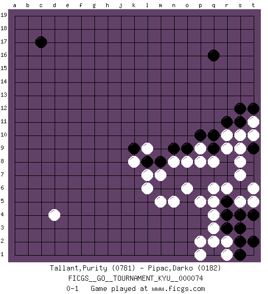 Last move : 0-1 2009 April 8 14:18:6 [Event "FICGS__GO__TOURNAMENT_KYU__000074"] [Site "FICGS"] [Date "2009.01.20"] [Round "1"] [Black "Tallant,Purity"] [White "Pipac,Darko"] [Result "0-1"] [Rating 1 "0781"] [Rating 2 "0182"] 1.q16 d4 2.c17 q4 3.r3 q3 4.q2 p2 5.q1 p1 6.r4 q5 7.r5 r2 8.s2 r1 9.s1 q2 10.s3 r6 11.s6 s7 12.r7 q6 13.q7 s5 14.t4 t6 15.s4 t5 16.t2 s8 17.q10 q8 18.p7 p8 19.r8 r9 20.o7 o8 21.n7 n8 22.q9 r10 23.r11 s10 24.s11 t11 25.t12 t10 26.s12 m7 27.m6 l6 28.m8 l7 29.l8 m5 30.n6 n5 31.p6 p5 32.t9 s9 33.n9 p9 34.p10 o6 35.o9 k8 36.k9 l9 0-1 This go game has been lost on time (started : 2009.01.20 13:31:20) Here are the names of the openings (joseki) played in the four corners : Corner q4 : q4 r3 Hoshi (Hwajeom, Seongjeom, Xingwei`) 4-4 Point. The star or hoshi (4-4) point, emphasizing influence at the potential expense of territory. Player White won this Go (weiqi, baduk) game. Follow this game move after move (download)Don't make empty triangles. (Anonymous) Drag your thoughts away from your troubles... by the ears, by the heels, or any other way you can manage it. (Mark Twain)