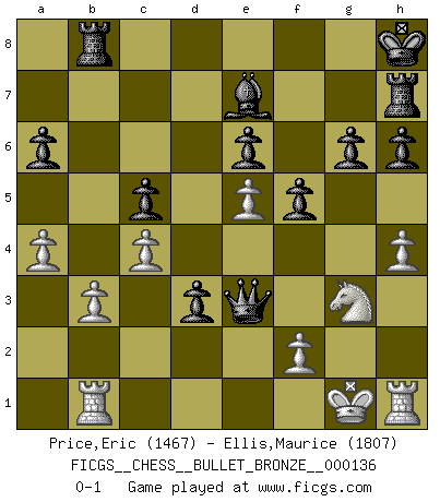 Last move : 0-1 2009 September 7 21:31:7 [Event "FICGS__CHESS__BULLET_BRONZE__000136"] [Site "FICGS"] [Date "2009.09.07"] [Round "1"] [White "Price,Eric"] [Black "Ellis,Maurice"] [Result "0-1"] [WhiteElo "1467"] [BlackElo "1807"] 1.e4 e6 2.d3 Nc6 3.Nf3 d5 4.e5 d4 5.Bf4 Nge7 6.c4 Ng6 7.g3 Be7 8.Bg2 O-O 9.O-O Nxf4 10.gxf4 f5 11.Kh1 Rb8 12.a4 b6 13.Nbd2 Nb4 14.Qe2 c5 15.Rg1 Bd7 16.b3 a6 17.h3 Kh8 18.Kh2 Rc8 19.Nf1 Qc7 20.N3d2 g6 21.Ng3 h6 22.Rae1 Rf7 23.Nf3 Rb8 24.h4 Rh7 25.Rh1 Bc6 26.Kg1 b5 27.Ra1 bxc4 28.dxc4 d3 29.Qd2 Qb7 30.Ne1 Bxg2 31.Nxg2 Nc2 32.Rb1 Qf3 33.Ne1 Nxe1 34.Qxe1 Qxf4 35.Qe3 Qxe3 0-1 French : King's Indian attack Kingside Castling by player Black (move 8) Kingside Castling by player White (move 9) Player Black won this chess game. Follow this game move after move (download)A passed Pawn increases in strength as the number of pieces on the board diminishes. (Capablanca) Dass jemand wie Surab Asmaiparaschwili, der selbst Elopunkte gekauft hat , Vize-Präsident der Fide werden konnte, sagt schon einges über den Zustand dieser Organisation aus. (Joel Lautier) Cuando la partida de Ajedrez termina, el Peón y el Rey regresan a la misma caja. (Irish saying) L'action d'une oeuvre littéraire se déroule sur un champ de bataille. Les masques et les types du drame moderne correspondent aux pièces du jeu d'échecs. L'intrigue correspond aux coups et aux gambits, c'est à dire aux techniques du jeu telles qu'utilisées et interprétées par les joueurs. Les tactiques et les péripéties [mouvements] correspondent aux coups exécutés par l'adversaire. (Viktor Shklovsky) The beginning of wisdom is silence. The second step is listening. (Unknown)