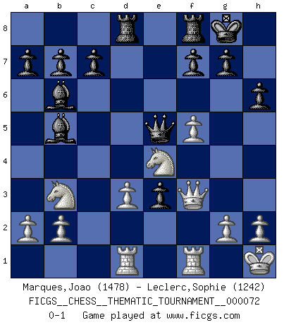 Last move : 0-1 2009 March 3 11:49:15 [Event "FICGS__CHESS__THEMATIC_TOURNAMENT__000072"] [Site "FICGS"] [Date "2009.01.23"] [Round "1"] [White "Marques,Joao"] [Black "Leclerc,Sophie"] [Result "0-1"] [WhiteElo "1478"] [BlackElo "1242"] 1.e4 e5 2.d4 exd4 3.f4 Nc6 4.Nf3 Bc5 5.Bd3 Nf6 6.O-O O-O 7.Nbd2 d6 8.Nb3 Bb6 9.e5 Ng4 10.exd6 Qxd6 11.Kh1 Ne3 12.Bxe3 dxe3 13.Ng5 h6 14.Ne4 Qe7 15.Qh5 Nb4 16.f5 Nxd3 17.cxd3 Qe5 18.Rab1 Bd7 19.Qf3 Bb5 20.Rbd1 Rad8 0-1 Halasz gambit Kingside Castling by player White (move 6) Kingside Castling by player Black (move 6) Player Black won this chess game. Follow this game move after move (download)There is only one thing Fischer does in Chess without pleasure: to lose ! (Boris Spassky) Der Partner hat auch seine Existenzberechtigung. (Savielly Grigorievitsch Tartakower) El Peón aislado arroja penumbra sobre todo el tablero. (Aaron Nimzovich) Les Echecs ont trois composantes : le temps, l'espace et le matériel en dernier. (Mikhail Tal) There are two kinds of people in the world, my friend. Those who have a loaded gun and those who dig. You dig ! (Blondie in The Good, The Bad and The Ugly)