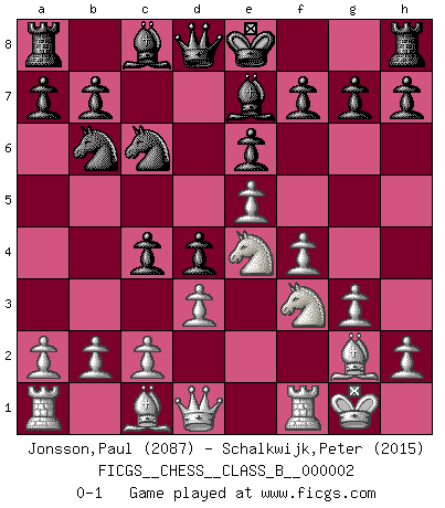 Last move : 0-1 2006 June 21 23:31:3 [Event "FICGS__CHESS__CLASS_B__000002"] [Site "FICGS"] [Date "2006.04.16"] [Round "1"] [White "Jonsson,Paul"] [Black "Schalkwijk,Peter"] [Result "0-1"] [WhiteElo "2087"] [BlackElo "2015"] 1.e4 c5 2.Nc3 e6 3.g3 Nc6 4.Bg2 Nf6 5.f4 d5 6.e5 Nd7 7.Nf3 Nb6 8.O-O d4 9.Ne4 c4 10.d3 Be7 0-1 Sicilian : Closed Kingside Castling by player White (move 8) Player Black won this chess game. Follow this game move after move (download)All my games are real. (Bobby Fischer) Computer sind die einzigen Gegner, die nicht immer eine Ausrede auf Lager haben, wenn sie gegen mich verlieren. (Robert James Fischer) La última cosa en que Fischer estaba interesado era en tonterías, siempre y cuando el Ajedrez estuviera involucrado. (Elie Agur) Les échecs, c'est l'art d'analyser. (Mikhail Botvinnik) Memory is a way of holding onto the things you love, the things you are, the things you never want to lose. (from the television show: The Wonder Years)