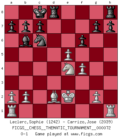 Last move : 0-1 2009 February 23 1:54:0 [Event "FICGS__CHESS__THEMATIC_TOURNAMENT__000072"] [Site "FICGS"] [Date "2009.01.23"] [Round "1"] [White "Leclerc,Sophie"] [Black "Carrizo,Jose"] [Result "0-1"] [WhiteElo "1242"] [BlackElo "2039"] 1.e4 e5 2.d4 exd4 3.f4 Nc6 4.Nf3 Bc5 5.c3 dxc3 6.Nxc3 Nf6 7.e5 Ng4 8.Ne4 Bb6 9.h3 d5 10.hxg4 dxe4 11.Qxd8+ Nxd8 12.Ng5 Bxg4 13.Nxe4 Nc6 14.Bd2 O-O-O 15.Be2 Bxe2 16.Kxe2 f6 0-1 Halasz gambit Queenside Castling by player Black (move 14) Player Black won this chess game. Follow this game move after move (download)Chess is the art which expresses the science of logic. (Mikhail Botvinnik) Darum geht es im Schach. Einen Tag gibst du deinem Gegner eine Lektion, am nächsten Tag gibt er dir eine. (Robert James Fischer) Fischer sacrificó virtualmente todo lo que la mayoría de nosotros los 'debiles' (término que él usa) valoramos, respetamos y apreciamos por el amor de un astuto, a menudo hermoso tablero de juego, por el privilegio ambivalente de ser su mas grande maestro. (Paul Kollar) On entre au jeu d'Echecs comme on entre en Religion. Pour le joueur d'Echecs, la partie d'Echecs c'est l'office, la messe, le défilé du 1er Mai, le dépôt de gerbe au Monument aux Morts. C'est un drame sacré. (Michel Roos) Optimism is a variety of information deficit. Sometimes especially true for correspondence chess games. (Michael Aigner)