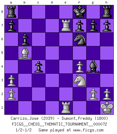 Last move : 1/2-1/2 2009 April 19 11:6:17 [Event "FICGS__CHESS__THEMATIC_TOURNAMENT__000072"] [Site "FICGS"] [Date "2009.01.23"] [Round "1"] [White "Carrizo,Jose"] [Black "Dumont,Freddy"] [Result "1/2-1/2"] [WhiteElo "2039"] [BlackElo "1800"] 1.e4 e5 2.d4 exd4 3.f4 Bc5 4.Nf3 Nc6 5.Bd3 Nf6 6.O-O d5 7.exd5 Nxd5 8.Re1+ Kf8 9.Be4 Qd6 10.Na3 Ne3 11.Bxe3 dxe3 12.Qxd6+ cxd6 13.c3 e2 14.Kh1 Be6 15.Rxe2 d5 16.Bd3 Bxa3 17.bxa3 Bg4 18.Rb1 b6 19.Rd1 Ne7 20.Rde1 Ng8 21.Bb5 Nf6 22.c4 dxc4 23.Re7 1/2-1/2 Halasz gambit Kingside Castling by player White (move 6) This chess game ended in a draw. Follow this game move after move (download)If I win a tournament, I win it by myself. I do the playing. Nobody helps me. (Bobby Fischer) Wie ich sie so einen nach dem anderen nieder mähte wurde meine Überlegenheit offensichtlich. (José Raúl Capablanca) La táctica fluye a partir de una posición superior. (Bobby Fischer) En blitz, le Cavalier l'emporte sur le Fou. (Vlastimil Hort) . 'gn is not allowed in chess unless n is an integer between 1 and 8 inclusive, where 1 and 8 are to interpreted as the standard numerals standing for integers in the ordered real-closed field R, with the *canonical* ordering. (As opposed to, say, an integer in the domain Z[2+i*sqrt(5)] or an integer in some exotic Grothendieck topos). (Normajean Yates)