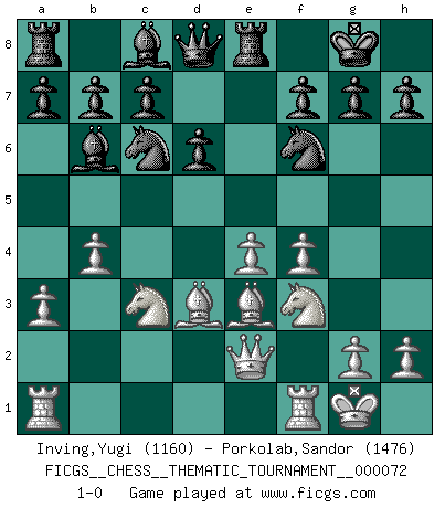 Last move : 1-0 2009 April 11 11:3:51 [Event "FICGS__CHESS__THEMATIC_TOURNAMENT__000072"] [Site "FICGS"] [Date "2009.01.23"] [Round "1"] [White "Inving,Yugi"] [Black "Porkolab,Sandor"] [Result "1-0"] [WhiteElo "1160"] [BlackElo "1476"] 1.e4 e5 2.d4 exd4 3.f4 Nc6 4.Nf3 Bb4+ 5.c3 dxc3 6.Nxc3 Nf6 7.Bd3 d6 8.a3 Ba5 9.Qe2 O-O 10.O-O Re8 11.b4 Bb6+ 12.Be3 1-0 Halasz gambit Kingside Castling by player Black (move 9) Kingside Castling by player White (move 10) Player White won this chess game. Follow this game move after move (download)Openings teach you openings. Endgames teach you chess ! (Stephan Gerzadowicz) Ein Teil des Fehlers ist immer korrekt. (Savielly Grigorievitsch Tartakower) El Ajedrez moderno está demasiado preocupado con cosas como la estructura de Peones. Olvidenlo, el Jaque Mate termina la partida. (Nigel Short) Karpov est une pièce de musée. (Garry Kasparov) Heh, heh, heh. Time to abandon ship. (General Grievous in Star Wars ep.3)