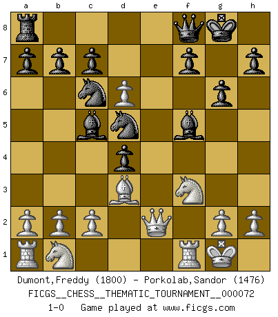 Last move : 1-0 2009 April 7 14:5:2 [Event "FICGS__CHESS__THEMATIC_TOURNAMENT__000072"] [Site "FICGS"] [Date "2009.01.23"] [Round "1"] [White "Dumont,Freddy"] [Black "Porkolab,Sandor"] [Result "1-0"] [WhiteElo "1800"] [BlackElo "1476"] 1.e4 e5 2.d4 exd4 3.f4 Bc5 4.Nf3 Nc6 5.Bd3 Nf6 6.e5 Nd5 7.Qe2 g6 8.O-O O-O 9.f5 d6 10.Bg5 Qe8 11.Bh6 Bxf5 12.Bxf8 Qxf8 13.exd6 1-0 Halasz gambit Kingside Castling by player White (move 8) Kingside Castling by player Black (move 8) Player White won this chess game. Follow this game move after move (download)Before the endgame, the Gods have placed the middle game. (Siegbert Tarrasch) Ich spiele 70 Eröffnungssysteme. (Viktor Kortschnoi) Una partida de Ajedrez se divide en 3 etapas: la primera cuando piensas que tienes la ventaja, la segunda cuando crees que tienes la ventaja y la tercera... ¡cuando te das cuenta que vas a perder!. (Savielly Tartakower) Les pièces de l'échiquier étaient impitoyables. Elles le retenaient, elles l'absorbaient. Il y avait de l'horreur en cela, mais aussi une harmonie unique. Car, qu'y a-t-il dans le monde, à part les échecs ? (V. Nabokov) Philosophers use a language that is already deformed as though by shoes that are too tight. (Ludwig Wittgenstein)
